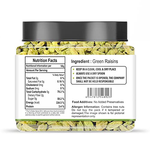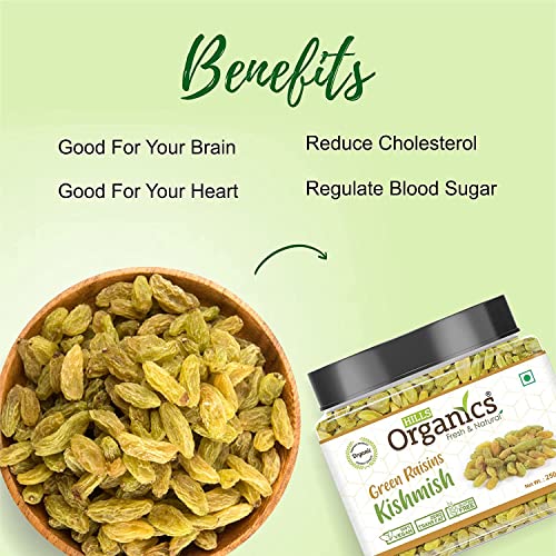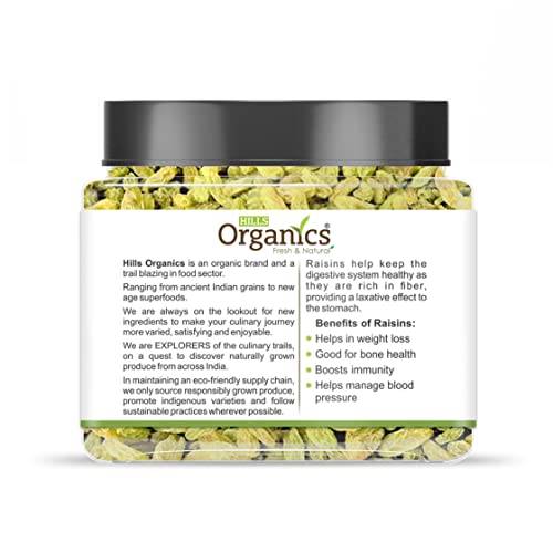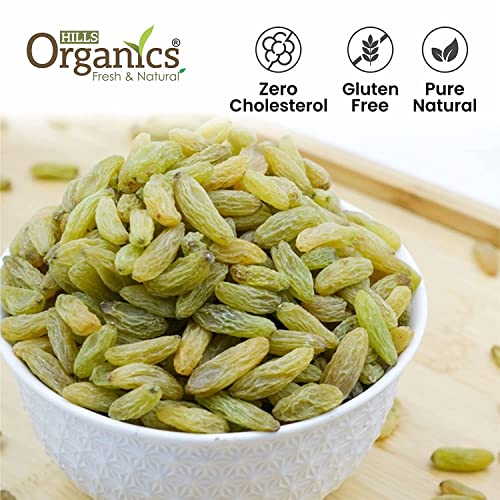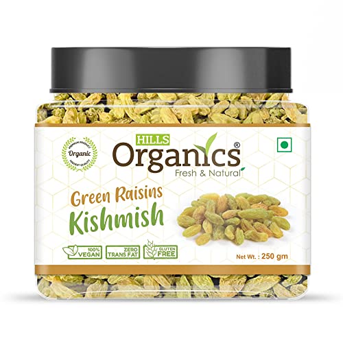 Indulge in the natural sweetness and premium quality of HILLS ORGANICS Green Raisins carefully sourced from the finest Indian vineyards.These Hari Dakh Kishmis are sun-dried to perfection preserving their vibrant green color chewy texture and rich nutritional benefits.Packed with essential vitamins minerals and antioxidants these raisins are a wholesome addition to your diet providing a natural energy boost and supporting digestive health.Free from added sugars or preservatives they are an ideal snack for health-conscious individuals.Enjoy these versatile green raisins in various ways whether as a standalone snack or as a delicious addition to your cereal yogurt salads or baked goods.Known for their mildly sweet flavor and soft texture these raisins are also perfect for enhancing traditional Indian desserts like kheer barfi and halwa.Packed in a convenient 100g resealable pack HILLS ORGANICS Green Raisins offer freshness quality and the promise of natural goodness with every handful.
