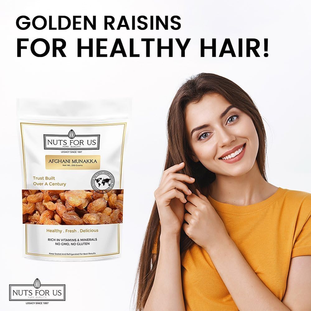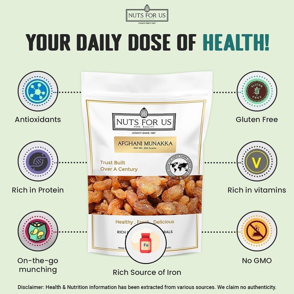 Nuts for Us Afghani Munakka also known as Afghan raisins. Packed in a pack of 2 250g bag these large king-size dried grapes are cultivated in Afghanistan and are a powerhouse of nutrients. Rich in energy fiber vitamins and minerals including iron and potassium these raisins make a wholesome addition to your diet. Traditionally sun-dried Afghani Munakka retains its natural sweetness and health benefits making it an excellent choice for cooking baking or simply snacking. Enjoy them as a healthy treat or add them to your favorite recipes for an extra boost of flavor and nutrition!