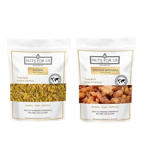 Nuts for Us Afghani Munakka also known as Afghan raisins. Packed in a 250g bag these large king-size dried grapes are cultivated in Afghanistan and are a powerhouse of nutrients. Rich in energy fiber vitamins and minerals including iron and potassium these raisins make a wholesome addition to your diet. Traditionally sun-dried Afghani Munakka retains its natural sweetness and health benefits making it an excellent choice for cooking baking or simply snacking. Enjoy them as a healthy treat or add them to your favorite recipes for an extra boost of flavor and nutrition! Nuts For Us Green Raisins! Our 400-gram pack of Kishmish is packed with essential nutrients making them a perfect snack for health-conscious individuals. These raisins are not only delicious but also offer numerous health benefits including support for weight loss improved digestion and enhanced bone health. Rich in potassium fiber iron and calcium our green raisins help curb sweet cravings without piling on calories. The high fiber content promotes a feeling of fullness aids in blood sugar control and supports weight management. Additionally their soluble fiber content aids digestion by providing a natural laxative effect while calcium and boron work together to strengthen bones and prevent osteoporosis. Enjoy them as a nutritious snack added to cereals or soaked for optimal benefits!