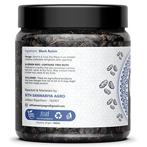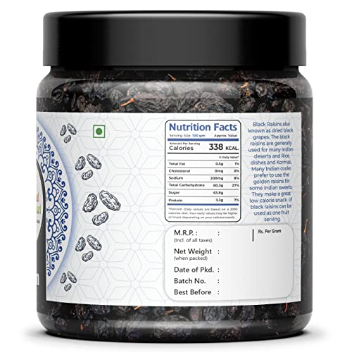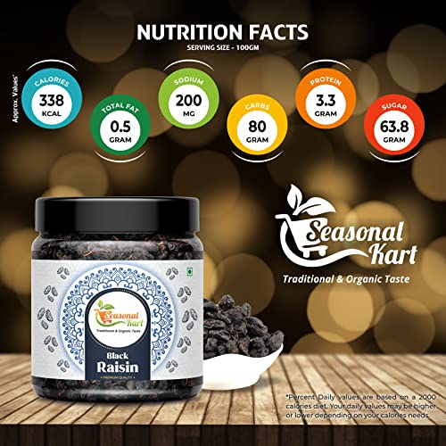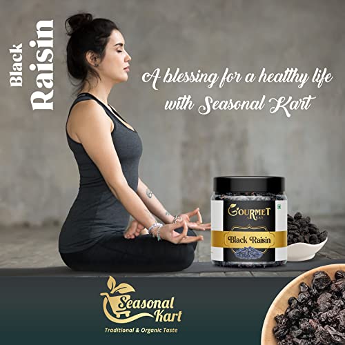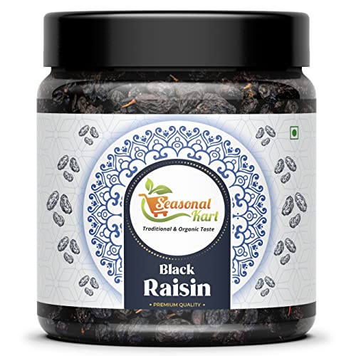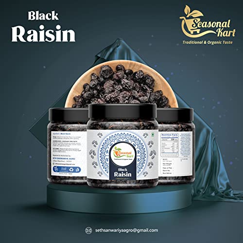 Seasonal Kart Black Raisins | Kala Kismish 200 gms | Dried Black Raisins | Black Raisins Healthy Routine Diet - Dry Fruit [Jar Pack] Kismis For Every Occasion and Gift Kishmish Healthy Routine Diet Draksha Kishmish | A raisin is a dried grape. Raisins are produced in many regions of the world and maybe eaten raw or used in cooking baking and brewing. Delicious products are amongst the best quality food products processed under strict professional supervision. A state-of-the-art Quality control vigil is kept throughout the process of picking and packing. Raisins boast of an impressive nutrient profile of vitamins such as vitamin c and vitamin k and minerals such as calcium iron copper manganese magnesium zinc phosphorous and selenium. We are all short on time and susceptible to the dangers of stressful environments. Quick fix snacks rob your body of what it needs: good nutrition. Coupled with healthy levels of activity nature provides all you need to sustain a healthy diet and energy. From low-sodium seeds that are beneficial to the nervous system to protein-powered fiber-rich nuts to give your body a mindful snack for a healthy lifestyle. Antioxidant protection. Raisins are a great source of energy. Raisins are charged with natural sugars like glucose and fructose. Green Raisins are large in size and have a sweet fruity taste and soft chewy texture. it is also known as Yellow Raisins. Raisins boast of an impressive nutrient profile of vitamins such as vitamin c and vitamin k and minerals such as calcium iron copper manganese magnesium zinc phosphorous and selenium.