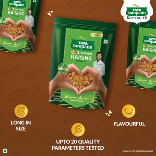 Introducing new â Tata Sampann Premium Raisins (Seedless)! Each pack contains the choicest selection of handpicked dried fruits with a promise to consistently deliver premium quality. Enjoy 100% pure Premium Raisins that are flavourful great in taste and long in size. As a consumer you seek freshness nutrition and quality in everything you buy. Premium packaging keeps goodness and quality intact ensuring great flavor. With Tata Sampann Raisins enjoy guilt-free indulgence always! Raisins are naturally rich in potassium which contributes to the maintenance of normal blood pressure. Use it as a festive gift hamper as a nutty delight to greet your guests or simply snack on it whenever you want. Buy Tata Sampann 100% Premium Raisins and other products in the range to bring happiness to your loved ones and yourself! Storage Instructions: Store in a cool and dry place. Transfer the contents to an airtight container after opening.