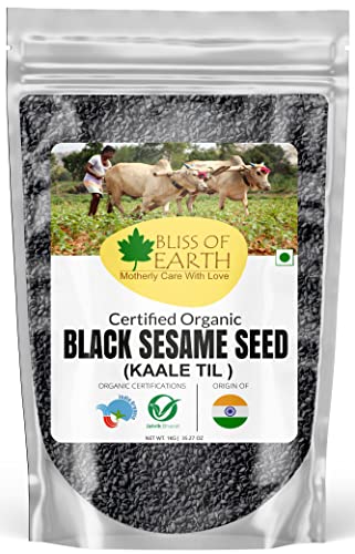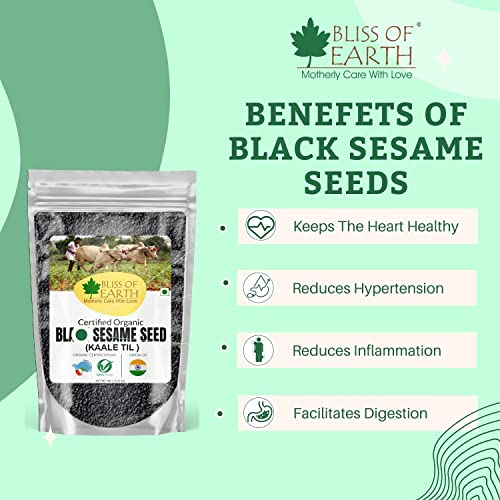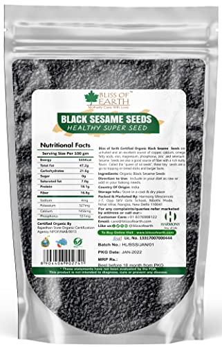 Bliss of Earth Certified Organic Black Sesame Seeds are unhulled and an excellent source of copper calcium omega fatty acids iron magnesium phosphorus zinc and selenium sesame seeds are also a good source of fiber with a rich nutty flavor. called the "queen of oil Seeds" these tiny seeds are a go-to topping on bread sticks and burger buns.