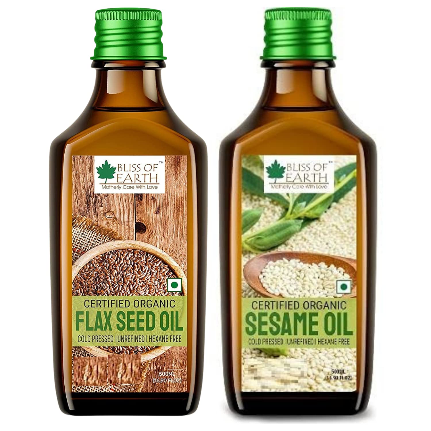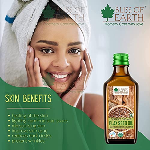 Bliss of Earth Certified Organic Flaxseed Oil is freshly cold pressed from certified organic flaxseeds. It provides one of the most concentrated vegan plant source of omega 3 & omega 9 fatty acids found in nature. Omega-3 fatty acids play a salient role in all sorts of bodily processes from inflammation to heart health to cognitive functions. Although lesser known flaxseed oil is a power-packed addition to your skin hair and health care regimen.