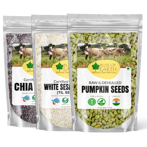 Bliss of Earth Organic White Sesame seeds are dehulled and are excellent source of copper calcium omega fatty acids iron magnesium phosphorus zinc and selenium. Sesame Seeds are also a good source of fiber with a rich nutty flavour. Called the queen of oil seeds these tiny seeds are a go-to topping on breadsticks and burger buns. Ingredients: Organic Sesame Seeds Bliss of Earth Certified Organic Chia Seeds are one of the healthiest food. They are loaded with nutrients that can benefit your body and brain. The high fiber and protein content in chia seeds can also helps in weight loss. Bliss of Earth Naturally Organic Pumpkin Seeds are dehulled and are one of the healthiest superfood. They are loaded with nutrients that can provide a substantial amount of healthy fats magnesium and zinc. Incorporating these seeds in your diet improves heart health & prostate health.