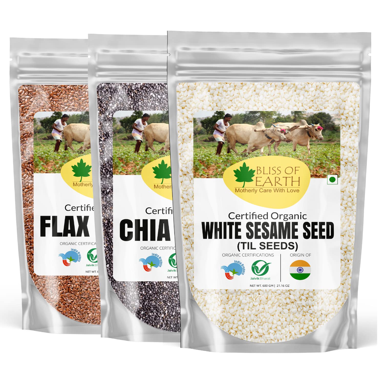 Bliss of Earth Organic White Sesame seeds are dehulled and are excellent source of copper calcium omega fatty acids iron magnesium phosphorus zinc and selenium. Sesame Seeds are also a good source of fiber with a rich nutty flavour. Called the queen of oil seeds these tiny seeds are a go-to topping on breadsticks and burger buns. Ingredients: Organic Sesame Seeds Bliss of Earth Certified Organic Chia Seeds are one of the healthiest food. They are loaded with nutrients that can benefit your body and brain. The high fiber and protein content in chia seeds can also helps in weight loss. Bliss of Earth Certified Organic Flax Seeds popularly known as Alsi is one of the popular health food due to its high content of hearth healthy OMEGA-3 fats fiber and other plant compounds. It offers many health benefits such as improved digestion and reduced risk of heart disease.