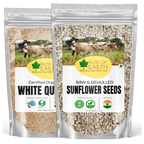 Bliss of Earth Certified Organic White Quinoa is one of the most popular healthfood. Its jigh in protein fiber magnesium B vitamins iron potassium calcium phosphorus vitamin E and various beneficial antioxidants. Its also one of the few plant foods that contain sufficient amount of all nine essential amino acids. Bliss of Earth Naturally Organic Sunflower Seeds are dehulled and are one of the healthiest superfood. They are loaded with nutrients that can provide a substantial amount of healthy fats beneficial plant compounds and several vitamns and minerals. Incorporating these seeds in your diet improves heart health & prostate health.