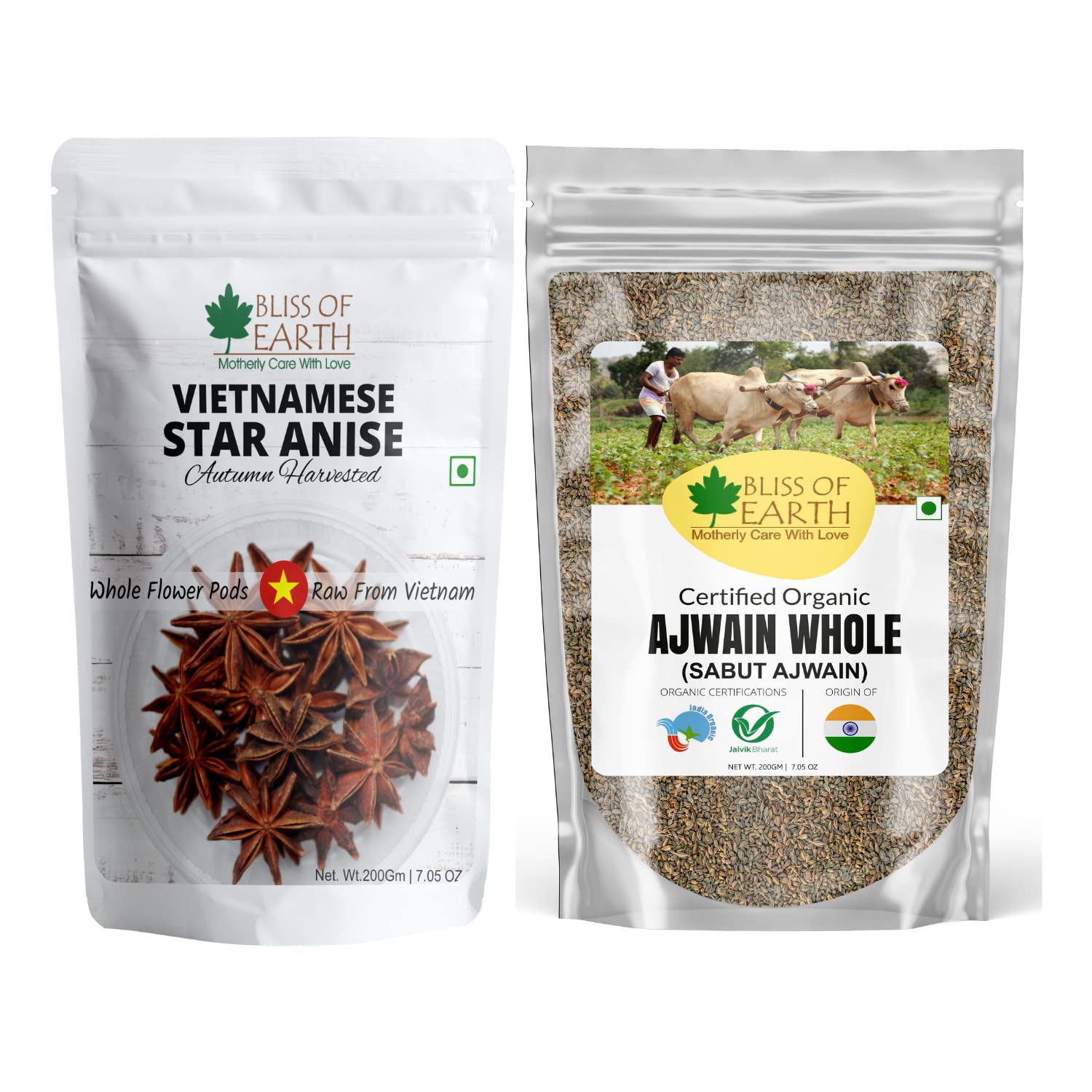 Bliss of Earth Star Anise also called as chakri fool in Hindi is a seed pod from the fruit of the ilium verum palnt. We hand picked our star anise in the autumn season from the evergreen shrub native to Vietnam which produces the finest & healthiest star anise. star anise has a very strong distinct flavor that is warmsweet and spicy and is commonly used for culinary applications as well as medicinal benefits. Bliss of Earth Certified Organic Carom Seed Popularly known as Ajwain in one of the main culinary spice and is traditionally known for promotion digestion and treating common cold