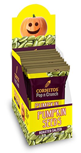 Cornitos roasted pumpkin seeds in a box containing 9 packs of 30g each.