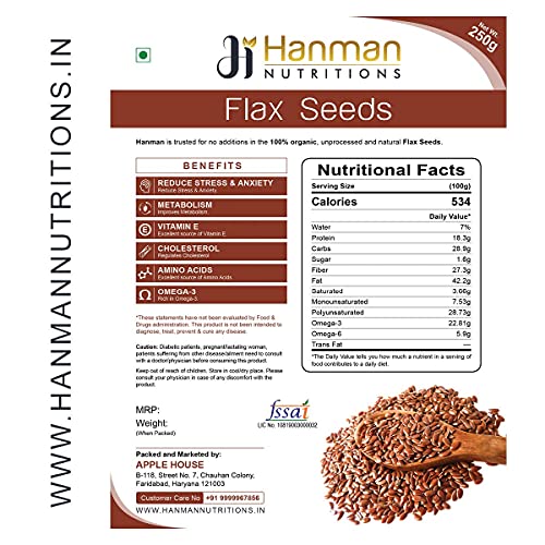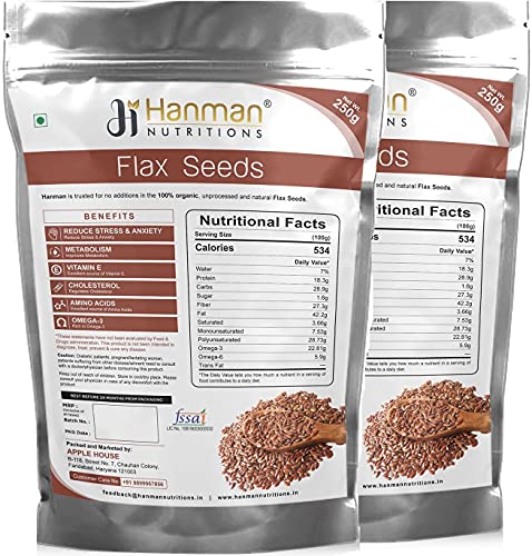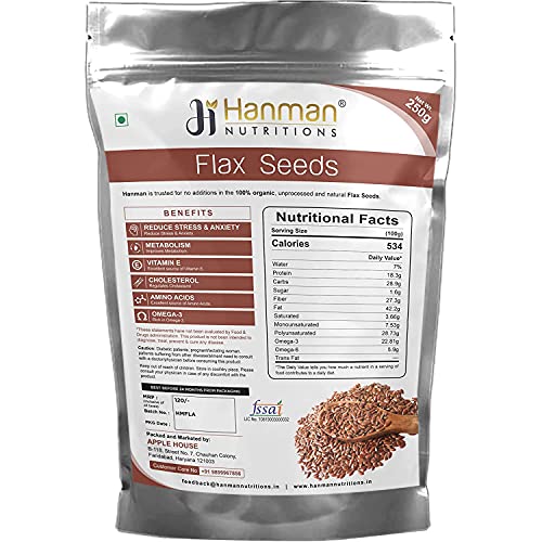 Hanman Nutritions 100% Natural Flax Seeds are a source of plant-based protein and can be a great alternative to vegan protein. Our flax seeds are farmed and harvested with the ensure purity & consistent quality. Apart from being a rich source of some vital vitamins and minerals. Since they are high in fibre content they help control appetite and give a full stomach feeling for a longer time. Flaxseeds enhance the nutritional value when added to your fluid and solid food intake Be it sprinkling on green salads smoothies adding to hot or cold cereals or your baked goods; Flaxseeds make a crunchy nutritious and tasty addition to your daily diet. Flax seeds 250g (pack of 2)