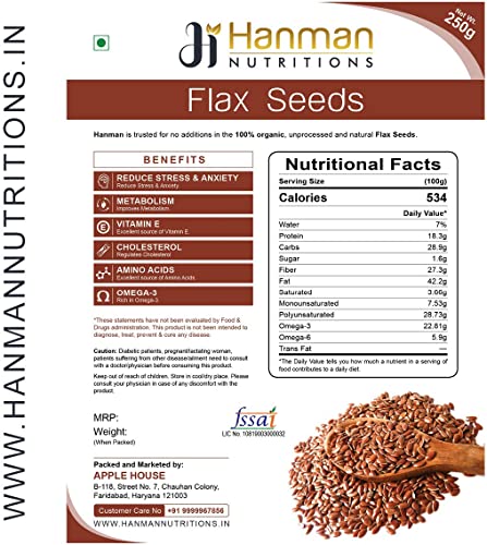 Hanman Nutritions 100% Natural Flax Seeds are a source of plant-based protein and can be a great alternative to vegan protein. Our flax seeds are farmed and harvested with the ensure purity & consistent quality. Apart from being a rich source of some vital vitamins and minerals. Since they are high in fibre content they help control appetite and give a full stomach feeling for a longer time. Flaxseeds enhance the nutritional value when added to your fluid and solid food intake Be it sprinkling on green salads smoothies adding to hot or cold cereals or your baked goods; Flaxseeds make a crunchy nutritious and tasty addition to your daily diet. Flax seeds 1 kg (pack of 2)