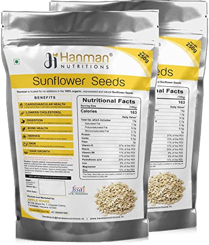 Hanman Nutrition Sunflower Seeds These tasty sunflower seeds are a perfect choice for a healthy and satisfying breakfast or snack offering a range of health benefits. Indulge the crunchy texture of these sunflower seeds. They are rich in protein providing a nourishing and energizing snack option. Sunflower seeds are also packed with antioxidants and vitamin E which contribute to overall well-being and support a healthy immune system. Our Popular Brand Hanman Nutrition ensures the premium quality of their sunflower seeds. Each pack provides a generous supply of these fiber-rich seeds allowing you to incorporate them into your daily diet easily. Enjoy them as a standalone snack add them to trail mixes or sprinkle them over salads for an extra crunch. These sunflower seeds are a perfect choice for those seeking a healthy and diet-friendly food option (pack of 250g x 2)