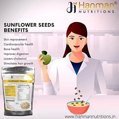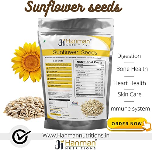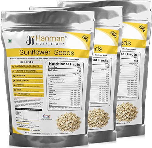 Hanman Nutrition Sunflower Seeds These tasty sunflower seeds are a perfect choice for a healthy and satisfying breakfast or snack offering a range of health benefits. Indulge the crunchy texture of these sunflower seeds. They are rich in protein providing a nourishing and energizing snack option. Sunflower seeds are also packed with antioxidants and vitamin E which contribute to overall well-being and support a healthy immune system. Our Popular Brand Hanman Nutrition ensures the premium quality of their sunflower seeds. Each pack provides a generous supply of these fiber-rich seeds allowing you to incorporate them into your daily diet easily. Enjoy them as a standalone snack add them to trail mixes or sprinkle them over salads for an extra crunch. These sunflower seeds are a perfect choice for those seeking a healthy and diet-friendly food option (pack of 250g x 3)