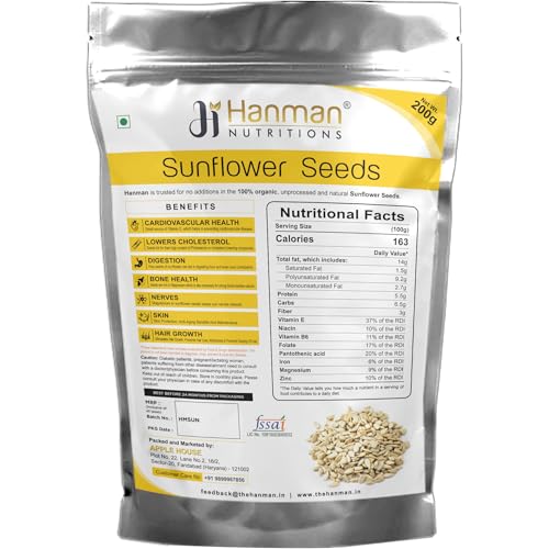 Sunflower Seeds Are Excellent Source of Various Nutrients Such as Vitamin E Iron Magnesium Zinc and Many More. Hanman Nutritions Delivers 100% Natural Organic and Unprocessed Sunflower Seeds. These Natural Ingredients Function as Antioxidants to Fights Against Various Chronic Diseases Like Inflammation Heart Disease and Diabetes. Sunflower Seeds Are Known for Its High Nutritious Value and a Distinctive Nutty Taste That Makes These a Must Have Addition in Our Diet. While Taking Care of Your Hunger It Also Enhances Your Health and Is Beneficial for Bone Health Skin Hair Growth and Nerves.