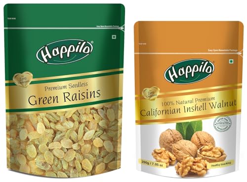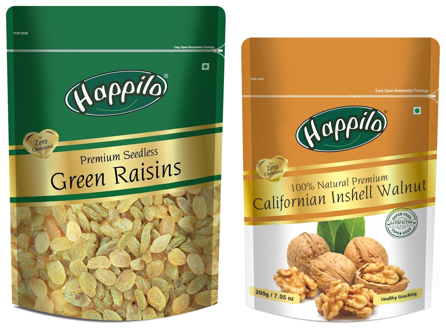 Happilo 100% Natural Californian Inshell Dried Walnut 200gWalnuts are deliciously healthy & great for snacking baking or cooking. These with shell raw walnut halves are mainly grown in California and Northern India. Eating raw walnuts is one of the easiest things to do to improve your health. Gluten free High in protein Walnuts High protein dietary fiber no gluten no GMO zero trans-fat zero cholesterol 100% natural nuts: Good for an active lifestyle perfect for snacking Low calorie nut low sodium ideal for weight watchers High in anti oxidants slows the ageing process & keeps diseases away Reduces the risk for heart disease cancer stroke diabetes high BP & obesityHappilo Premium Seedless Green Raisins 250g | Premium Kishmish/Kismis | Rich in Iron & Vitamin B |Happilo has travelled the world to get the finest gourmet dry fruits. They are one of the most nutritious dried fruits in the world they're a yummy healthy snack. Great for Snacking adding to Cereal Cooking and Baking. High Antioxidants Dietary Fiber No Gluten Non GMO Zero Trans Fat & Zero Cholesterol. Daily need products for a healthy and energetic life. Happilo Zip Lock Pouch with airtight seal to ensure the product is protected and fresh. Quality assured - Happilo products are rigorously tested against the industry's best quality standards.