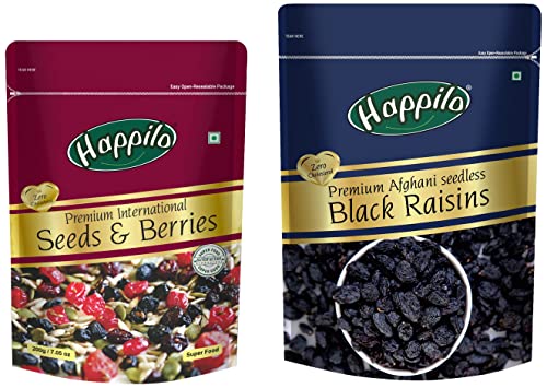 Happilo Premium Afghani Seedless Black Raisins 250gRaisins are the original candy nature's candy. They are one of the most nutritious dried fruits in the world. Famous for their sweetness so they're a yummy healthy snack. These are out of this world. They have double the deliciousness of ordinary raisins. Great for snacking adding to cereal cooking and baking.Happilo Premium International Whole Seeds & Berries Pouch 200 gHappilo has travelled the world to get the finest gourmet dry fruits dried fruits nuts berries and dates. Indulge into the gourmet and grocery world of Happilo with awesome natural nuts and dry fruits along with the unique dry fruit mixes fusions and flavoured dry fruits healthy seeds and dried berries specially crafted for your taste and health. Happilo dry fruit gift boxes and festive dry fruits and nuts gift pack brings health happiness and love to gift to your colleagues friends and family.