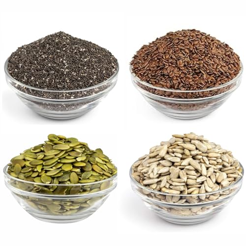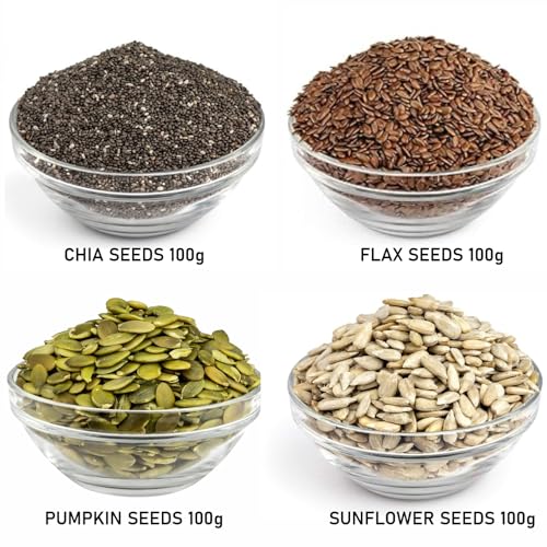 Elevate your daily nutrition with this premium seed mix set featuring four essential varieties. Each pack contains 100g of nutrient-rich seeds: chia seeds packed with omega-3 fatty acids and fibre flax seeds renowned for their lignans and protein content pumpkin seeds rich in zinc and magnesium and sunflower seeds abundant in vitamin E. This versatile collection is perfect for enhancing your breakfast bowls salads or enjoying as a wholesome snack. The seeds can be sprinkled over yoghurt blended into smoothies or used in baking. Each variety brings its unique nutritional profile and subtle flavour notes making this mix an excellent addition to a balanced diet. The convenient 100g portions allow you to experiment with different combinations or use them individually. Store in a cool dry place to maintain freshness and natural goodness. These raw seeds are naturally rich in protein healthy fats and essential minerals making them an ideal choice for health-conscious individuals looking to add more nutritional variety to their meals.