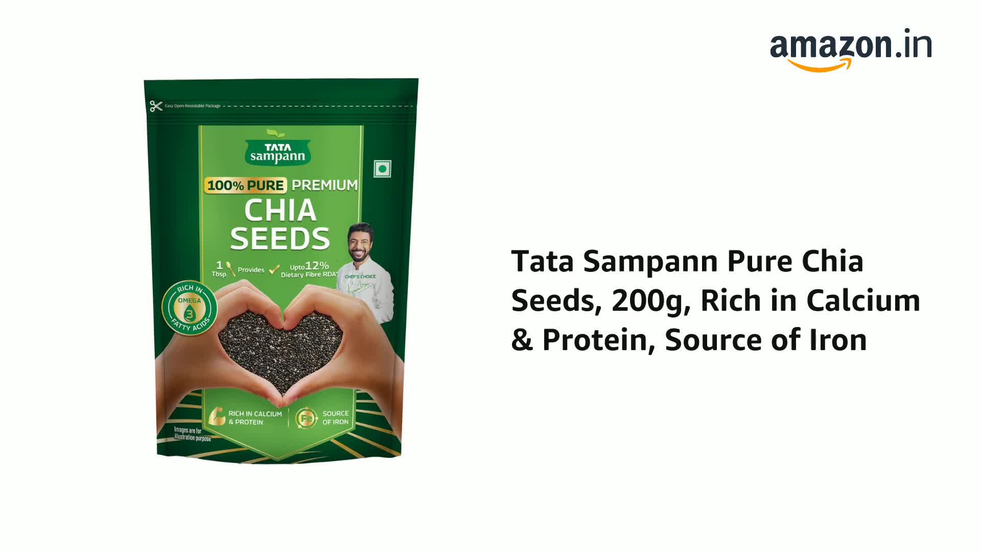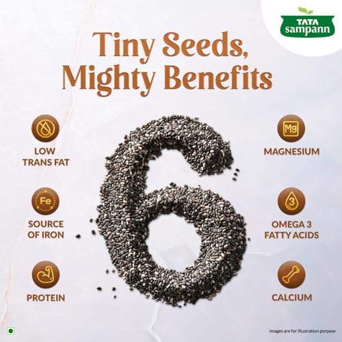 Elevate your well-being with more nutrients! Bring home the powerhouse of nutrition with Tata Sampann Premium Chia Seeds. Packed with essential nutrients like Magnesium Calcium these chia seeds contribute to the maintenance of normal bones. Tata Sampann chia seeds are rich in protein which is essential for muscle maintenance. 1 tbsp. of these trans fat free pure chia seeds provides up to 12% of Dietary Fibre RDA*(Recommended Dietary Allowance) which is considered good for the gut. Tata Sampann chia seeds are rich in omega-3 fatty acids. The chia seeds are not only rich in nutrients but are incredibly versatile too. Whether you add these seeds as topping to your oatmeal yogurt salad porridge etc. or use them in your baked cookies and bars chia seeds are a great addition to any meal. Make a nutritious and delicious choice with Tata Sampann Premium Chia Seeds. Storage Instructions: Store in a cool or dry place away from direct sunlight & moisture.
