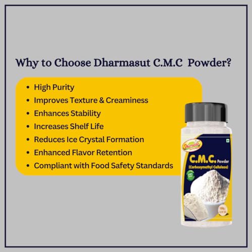 Dharmasut CMC Powder is a thickening agent that can be used to make ice cream frozen yogurt and other desserts. CMC powder works by absorbing water from the surrounding environment and increasing the thickness of the product. It also improves mouthfeel by providing a firm yet smooth texture to your food products. CMC powder is widely used in ice cream baking breads and cakes.