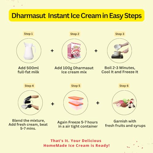 Direction for Making Delicious Ice Cream at Home Set the freezer temperature at a high 1/2 hour before preparing the mixture of Ice-cream. Add "Dharmasut Ice cream mix Powder" to 1/2 liter full-fat milk. Keep to boil and stir for 2-3 minutes till the mixt
