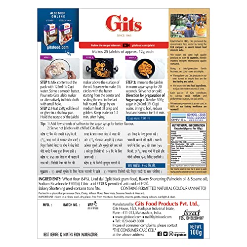 Jalebi is a very popular and a much-loved Indian sweet dish that can be had both as a dessert and a quick snack. Crispy saffron-coloured Jalebis are made out of fermented wheat and lentil dipped in sugar syrup and consumed either hot or cold. The Gits Jalebi Dessert Mix with easy maker bottle is an instant solution to your dessert plans after family meals. The cooking process is made simple with a single mix which can be used to prepare the batter for your Jalebis. Also replace the traditional Jalebi cloth with the easy-to-use cone bottle that comes in the pack and shape your Jalebi pieces like a professional! You can even make baby Jalebis for your little ones with this instant mix. Jalebis are usually served along with a generous portion of flavoured and condensed milk - chilled Gits Rabdi and the combo tastes like heaven. Gits dessert ready mixes are made using the finest ingredients and with the suggested recipes you can make fantastic homemade Indian mithais. A 3-generation family-owned business Gits can help you make perfect delicious and flavour-filled Indian sweets and savouries.