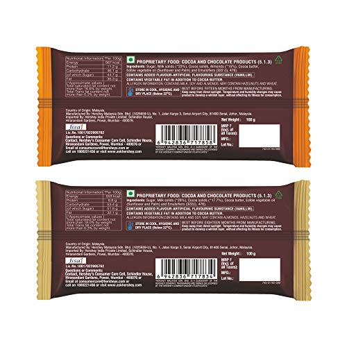 Presenting iconic HERSHEY'S American chocolate bar from the house of HERSHEY company. HERSHEY'S Milk Chocolate Bar is a flagship chocolate bar manufactured first by The Hershey Company. Hershey refers to it as "The Great American Chocolate Barâ. It's a perfect delight for snacking. HERSHEY'S Bar are available in India in 3 unique flavors: (1) HERSHEY'S Creamy Milk sets the standard for chocolate bars (2) Cookies ân' Crème with its creamy texture and cookie bits is indeed a true joy (3) Hershey's Almonds Bar with âWhole Roasted California Almonds' in simply irresistible and a must try. These smooth creamy indulgent delicious & mouth-watering chocolate bars are a classic treat that all can enjoy. HERSHEY'S bars are perfect for using in deserts. They are great as a party favor or stocking stuffer too. Whether you are celebrating with friends family colleagues or spending quality time at home HERSHEY'S Bars can be your perfect partner. These delights can be delightful gifts too for various gifting occasions. These chocolate bars are individually wrapped with quality standards & utmost safety protocols. Perfect for keeping on hand at home or the office. Sweeten up any day at home outdoor school or the workplace with HERSHEY'S smooth creamy chocolate bars!! Try HERSHEY'S bars today. HERSHEY'S bar are now available in India in 3 delightful flavors in 2 pack sizes. 40g trial pack and 100g packs at affordable price points. Go pick your favorite HERSHEY'S bar today.