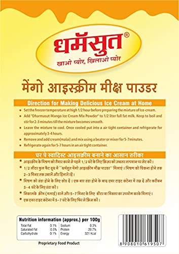 Dharmasut's Instant Mango Ice cream powder gives you the delight of sweet mangoes melting in your mouth. The rich flavor of mangoes and the tangy sweetness of Dharmasut Instant Mango Ice Cream make the perfect choice for homemade Ice cream.Mango ice cream mixes are filled with the wholesome goodness of mangoes with super creaminess. A mango-flavored instant ice cream mix tastes like fresh mango ice cream with a touch of sweetness. Easy to make tasty to serve. Assurance of quality. Our ice cream mix is made with 100% vegetarian and quality ingredients like SugarEdible Starch Permitted Stabilizer & Thickening Agent Dried Milk Artificial Flavoring Substance. Mango ice cream mixes can be used as a twist in shakes and smoothies. You can make ice cream from ice cream remix and serve a scoop with shakes to your loved ones. Mango ice creams are more than just a flavored dessert they are an entirely new experience. Be sure to grab it whenever you get a sweet tooth tingle. Check out our other flavours such as Vanilla Butterscotch and Chocolate Ice Cream Powder as well.