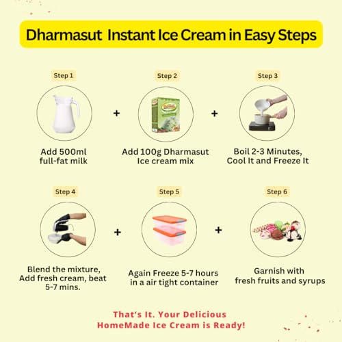 Direction for Making Delicious Ice Cream at Home Set the freezer temperature at a high 1/2 hour before preparing the mixture of Ice-cream. Add "Dharmasut Ice cream mix Powder" to 1/2 liter full-fat milk. Keep to boil and stir for 2-3 minutes till the mixt