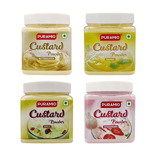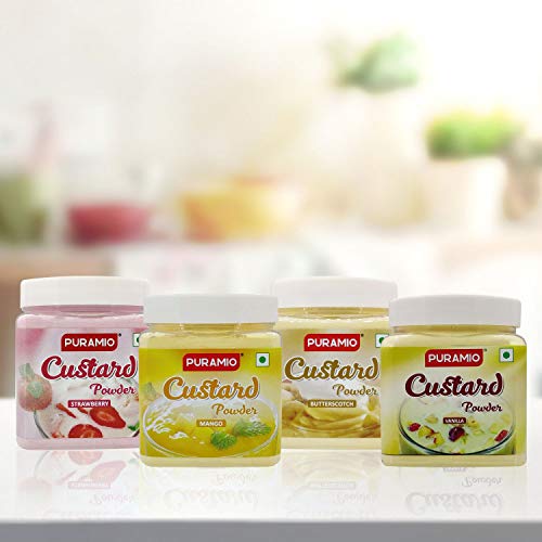 It could be a mouth - watering dessert for all age groups Enjoy the taste of delicious and flavorful Custard Powder's Puramio Custard Powder helps you prepare rich and creamy custard which will leave your family and guest amazed Consume it hot or cold Puramio Custard Powder is available in four mouth watering flavors: Strawberry Mango Vanilla and Butterscotch. Puramio Custard Powder can be served as a regular custard or it can be added in creamy puddings trifle as a thickener which provides smooth and rich texture.