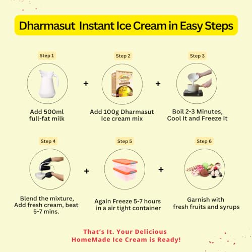 • Direction for Making Delicious Ice Cream at Home Set the freezer temperature at a high 1/2 hour before preparing the mixture of Ice-cream. Add "Dharmasut Ice cream mix Powder" to 1/2 liter full-fat milk. Keep to boil and stir for 2-3 minutes till the mixt