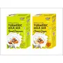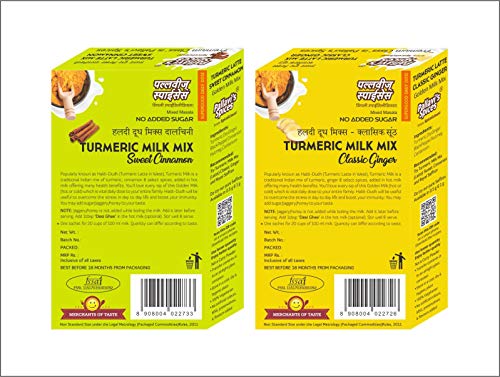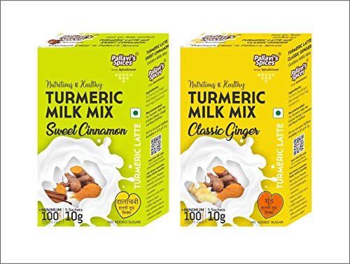 Turmeric Milk Mixes has 1 Classic Ginger and 1 Sweet pack of 50g. One 50g pack each contains 5 sachets of 10g. One sachet is good for 20 cups of 100 ml milk. Quantity can differ according to taste. Popularly known as Haldi-Dudh (Turmeric Latte in West) this is a traditional Indian mix of turmeric ginger Ginger/ & select added in hot milk offering many health benefits.. You may add jaggery/honey to your taste. Add 1tbsp Desi Ghee in the hot milk (optional). Stir well & serve. Note: Jaggery/honey is not added while boiling the milk. Add it later before serving.