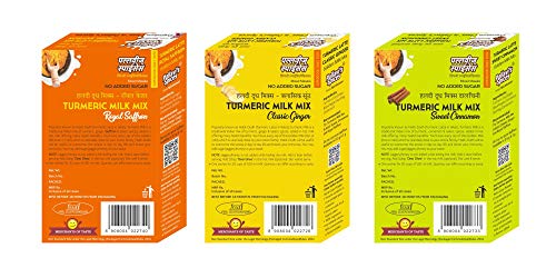 Turmeric Milk Mixes has 1 Classic Ginger I Royal Saffron and 1 Sweet pack of 50g. One 50g pack each contains 5 sachets of 10g. One sachet is good for 20 cups of 100 ml milk. Quantity can differ according to taste. Popularly known as Haldi-Dudh (Turmeric Latte in West) this is a traditional Indian mix of turmeric Saffron/Ginger/ & select added in hot milk offering many health benefits.. You may add jaggery/honey to your taste. Add 1tbsp Desi Ghee in the hot milk (optional). Stir well & serve. Note: Jaggery/honey is not added while boiling the milk. Add it later before serving.