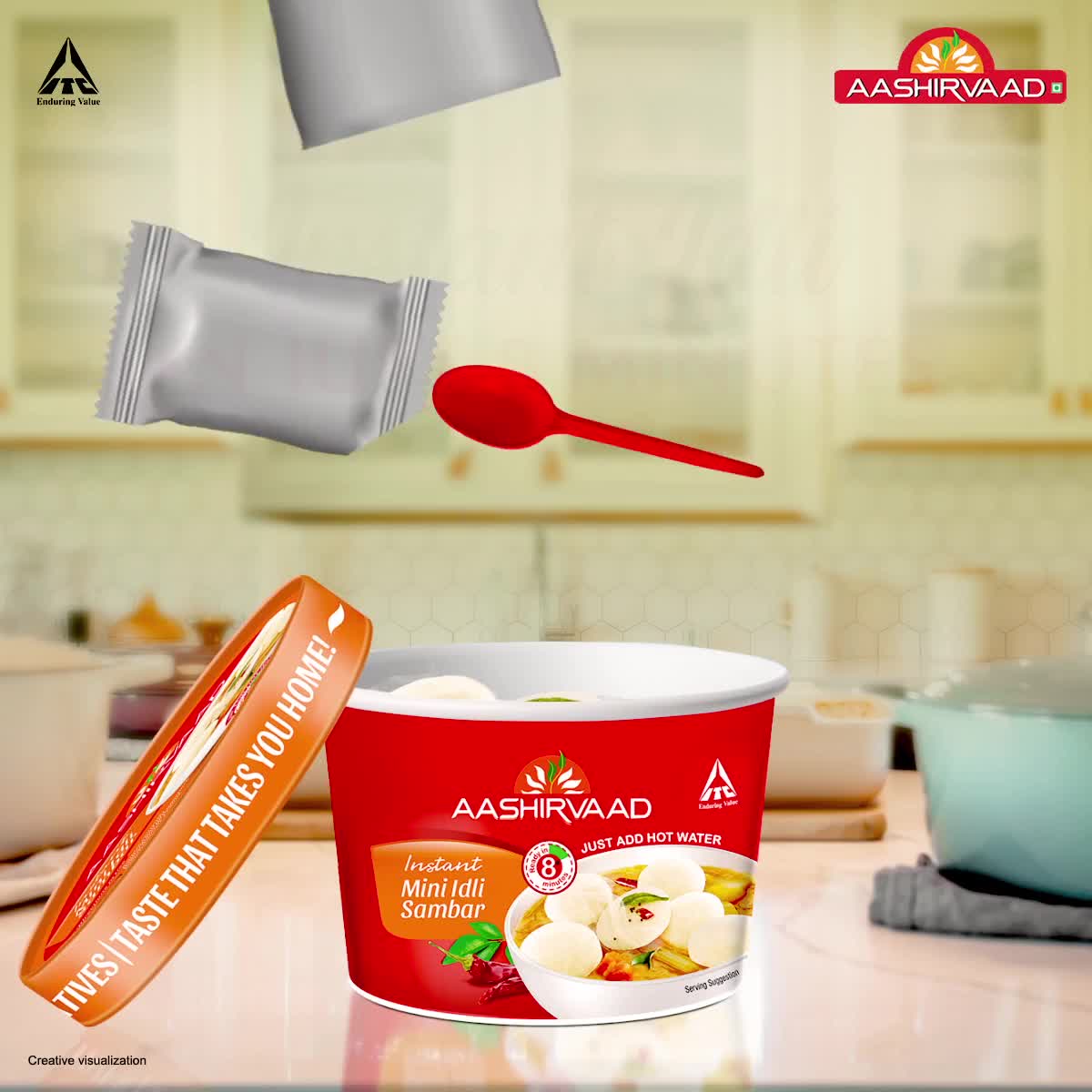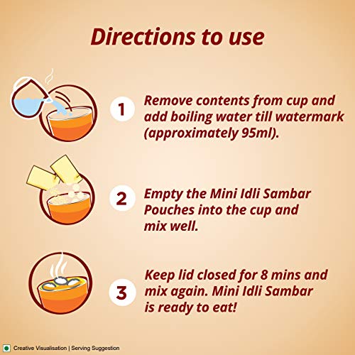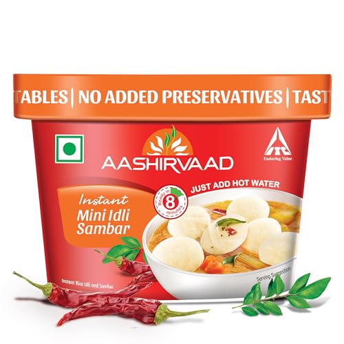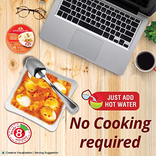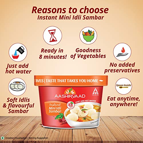 Aashirvaad Instant meals range promises an authentic taste that takes you home. Convenient and easy-to-make these ready-to-eat instant meals can be made in just a few minutes. Tired of ordering food from outside every day? No worries. Get a pack of Aashirvaad Instant Mini Idli Sambhar add hot water stir and your instant breakfast will be ready in just 8 minutes! Conveniently packed in a cup you can now relish the taste of home anytime and anywhere. Soft and fluffy idlis are immersed in hot sambhar which is flavoured with tamarind curry leaves chilli and ghee. Rich in flavour and goodness it will remind you of your home.