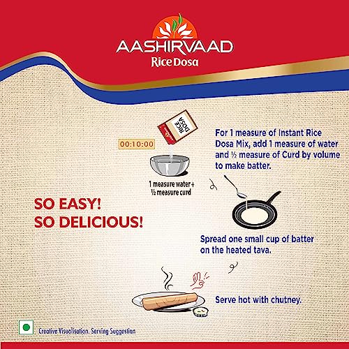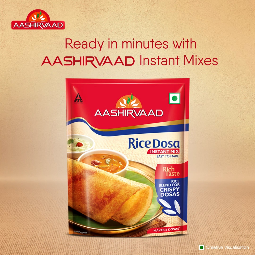 Launched in March 2006 Aashirvaad Instant Mix range promises discerning Indian homemakers authentic tasting dishes that are easy to make.Savour the all-time favourite South Indian dish with Aashirvaad Instant Mix Rice Dosas. Relish it as a yummy breakfast or a delicious meal or as a quick snack anytime you want. Because all you have to do is follow 3 quick and easy steps and voila! Tasty and healthy Rice Dosa are ready easily.Enjoy crispiest dosas every time as the instant mix includes rice flour and urad dal. Each pack of Aashirvaad Instant Mix can make 20 Rice Dosas. So store it in a cool dry place and you can use it repeatedly over a period of time.Convenient to make and authentic in taste Aashirvaad Instant Mix range also includes the decadent Indian sweet - Gulab Jamun and tasty South Indian favourites - Rava Idli and Rice Dosa.
