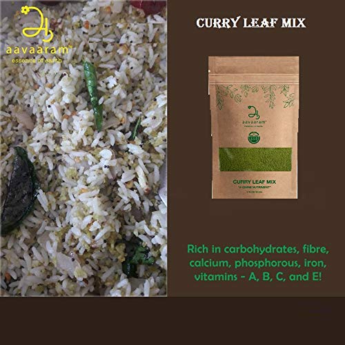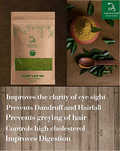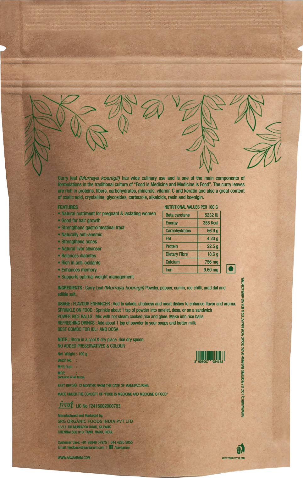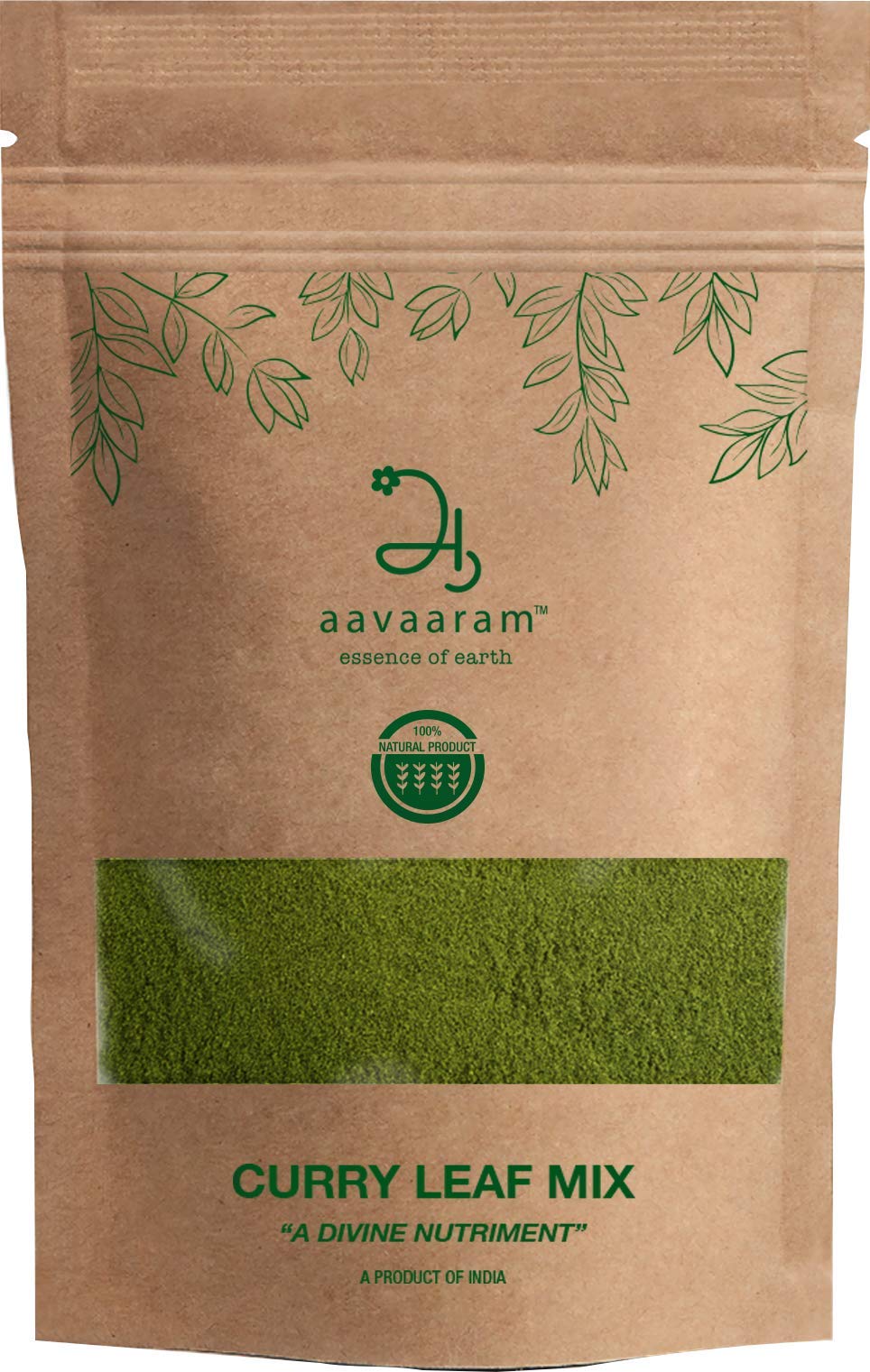 Aavaaram Curry Leaf Powder is made under the concept of âFood as Medicine and Medicine as Foodâ by following natural farming and non-chemical process. Fresh green leaves harvested from organic farms are shade dried in hygienic condition to preserve the wholesome nutrients. The Sweet neem leaves are rich in flavonoids & vitamins that improve liver function and purify blood.