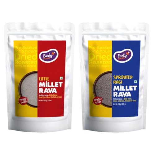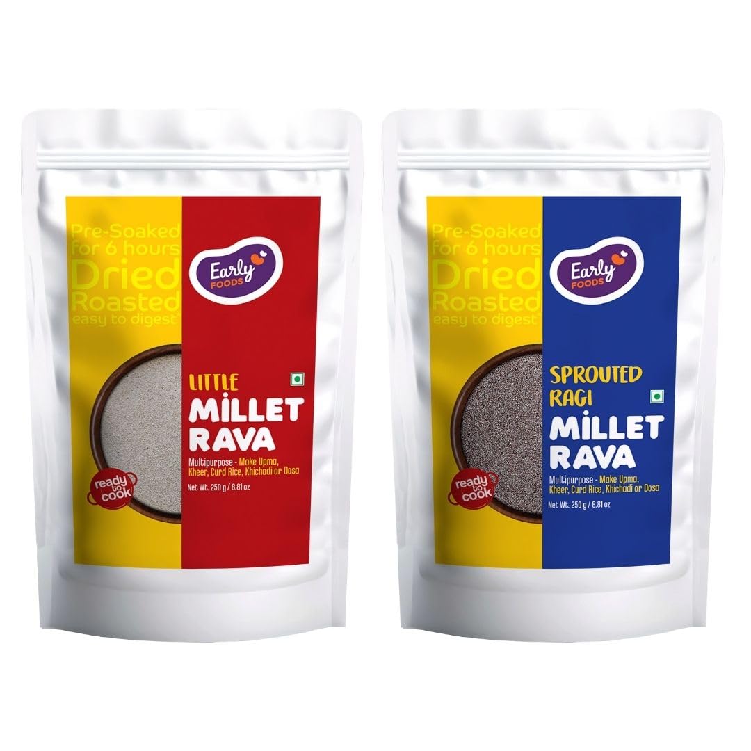 Early Foods : Assorted Pack of 2 - Little Millet & Sprouted Ragi/Finger Millet Rava | Instant Millet Suji | Roasted Millet Rava | Millet Idli Rava | Soaked for 6Hrs | Instant Breakfast Mix