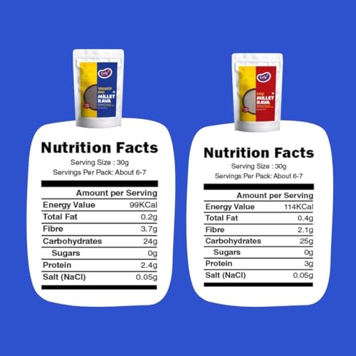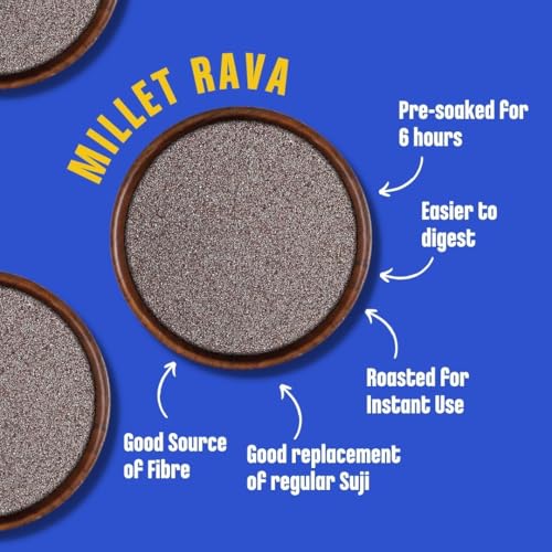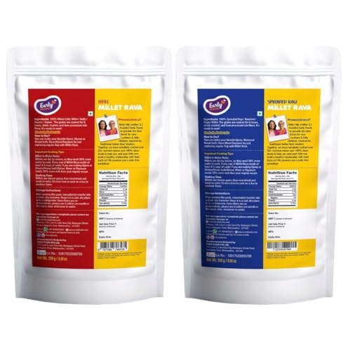 • Freshly made ready to cook 2 packs of multipurpose Rava 500g. Pack 1 - Little Millet Rava 250 gms Pack 2 - Sprouted Ragi/Finger Millet Rava 250 gms