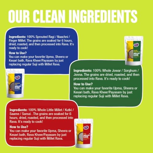 • Goodness of Millets: Our Sprouted Ragi Jowar Millet & LIttle Millet Rava are made from 100% Whole grains broken down into fine rava consistency to make traditional delicacies.