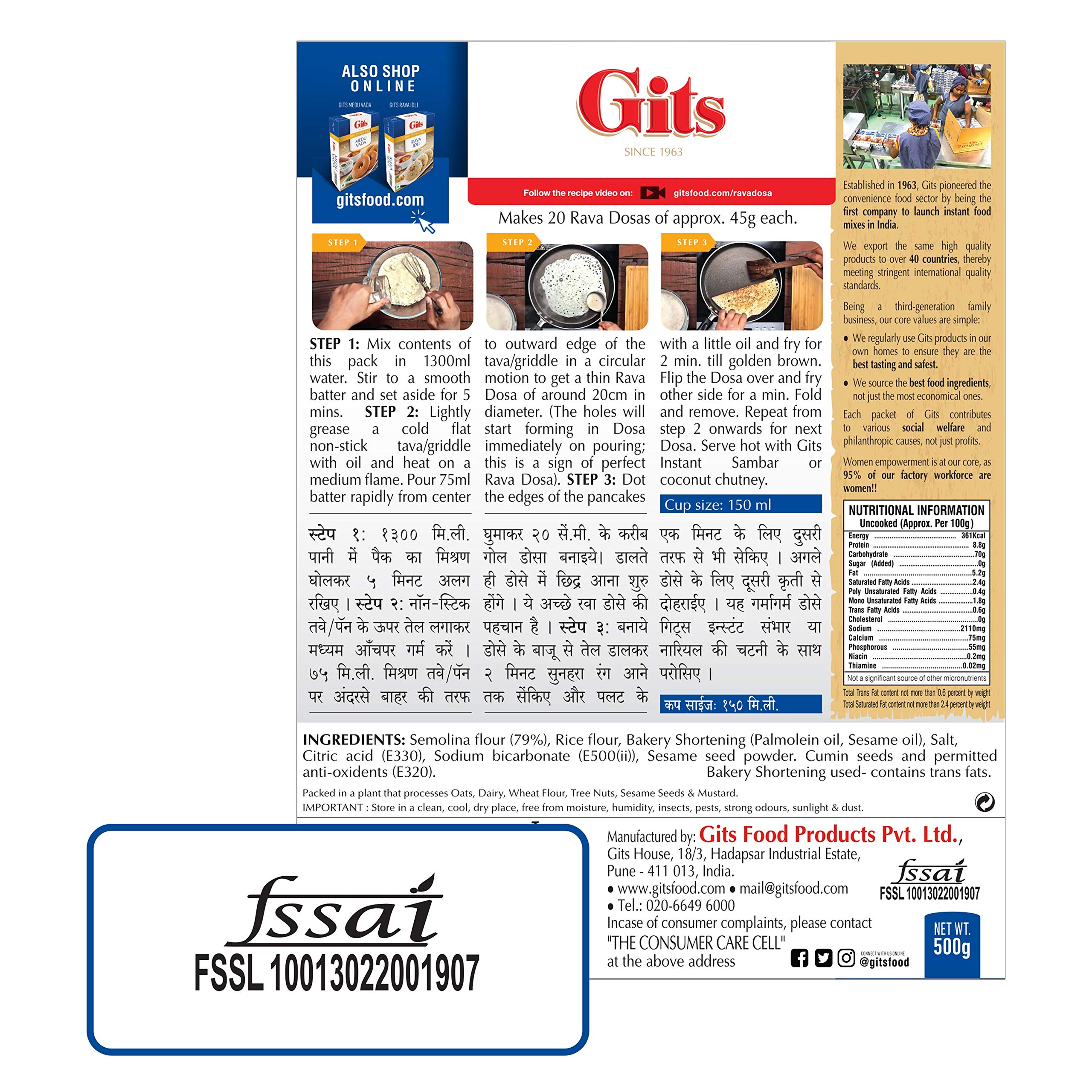 Gits Instant Rava Dosa Breakfast Mix Makes 20 per Pack Pure Veg South Indian Recipe 500g