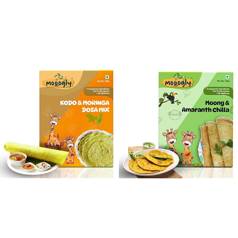 Mooogly Moong & Amaranth Chilla Mix + Kodo & Moringa Dosa Combo: Instant Vegan High-Protein Gluten-Free Antioxidant Rich Ready-to-Cook Meals