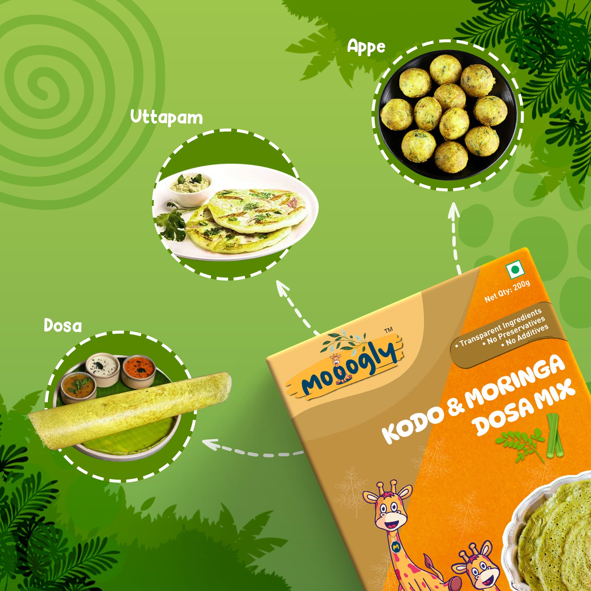 INSTANT INDULGENCE Elevate your breakfast with Mooogly's Kodo & Moringa Dosa Mix 200g an INSTANT DOSA MIX for a hassle free gourmet experience.
