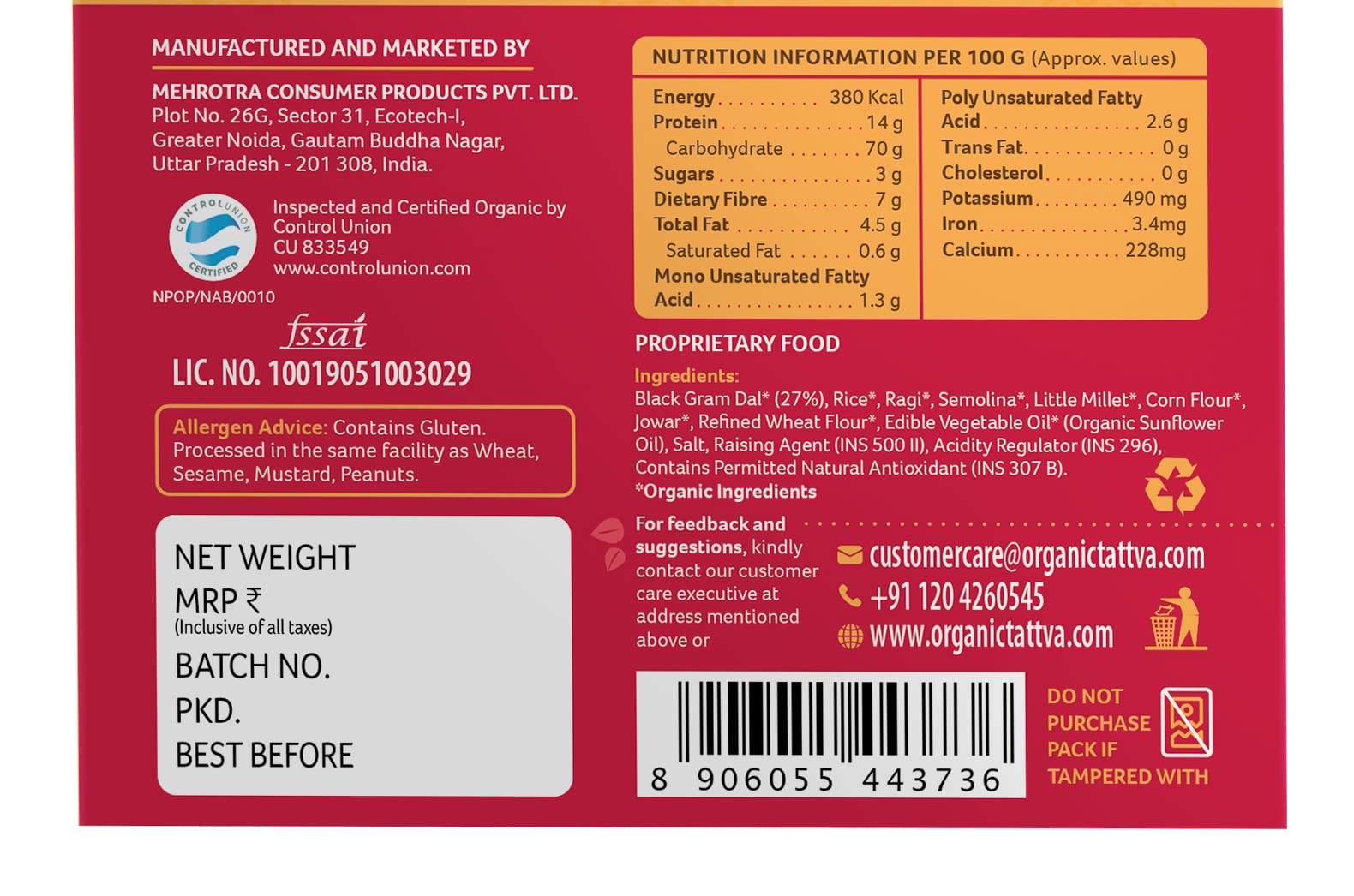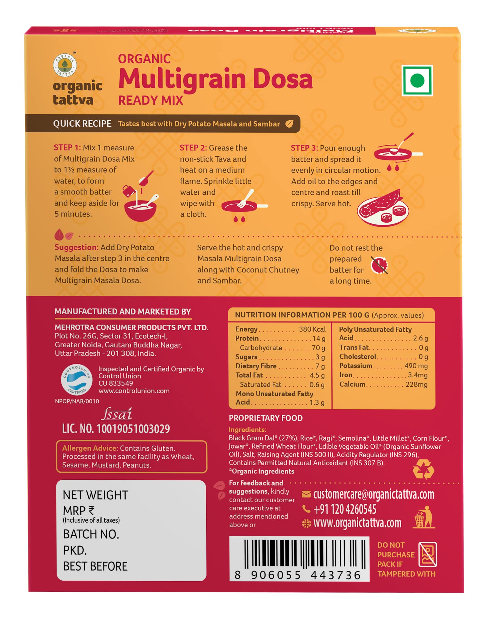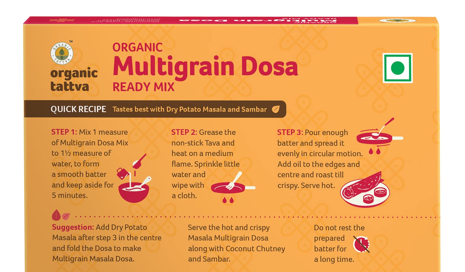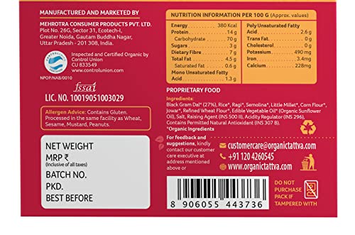 Making healthy and tastier Dosas just got easier! Organic Tattva's Organic Multigrain Dosa Mix helps you make a Delectable Meal in No Time! Moreover it is highly nutritious made with a blend of Corn Flour Jowar and Rice flour and has benefits of organic sunflower oil and natural Salt. This easy to make dosa mix is tasty healthy and perfect for you and your family. It is in an Instant and easy to cook format healthy breakfast. Prepared with the high-quality ingredients to help you add value to your food. Organic Tattva's Organic Multigrain Dosa mix is made from organic ingredients. This healthy dosa mix is based on homemade recipe and is 100% natural. Millets are gluten free fiber vitamins and minerals. Organic Multigrain Dosa mix is also a weight loss dosa mix because it will help to control your appetite. Devour it as a delightful family meal or as a snack to honor taste cravings within a matter of minutes. A convenient way of including Millets in your daily meals helping you stay fit & healthy.