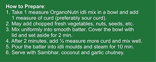 Organo Nutri Instant Rawa Idli Mix. Prepare approx 12 rawa idli in an instant. Add only sour curd and rest all ingredients are in this mix.Idli is one of the most popular breakfast dishes from south India. But it is not limited to south India; Idli is prepared across entire India even for lunch and dinner. Idli itself gives slightly sour taste but they are served with traditional curry known as Sambhar. Preparing Idli involves preparation of special parboiled Idli rice; and after a long fermentation process the final batter gets ready which is then steamed to prepare round cakes.