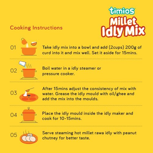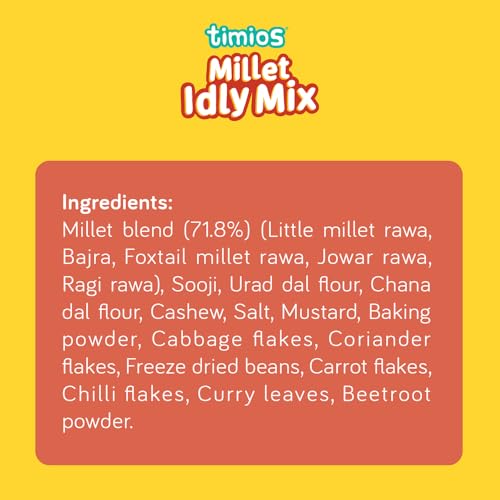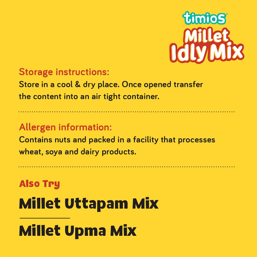 Eating healthy just got better! Timios brings to you a delicacy from South India that is 100% healthy & 100% tasty. A quick and easy breakfast solution perfect for busy mornings. Timios idly mix is made with ingredients like rawa bajra jowar ragi foxtail along with sooji urad dal chana dal. These have high quantities of nutritients like proteins iron calcium essential vitamins & minerals for a power packed day supporting healthy growth and development.