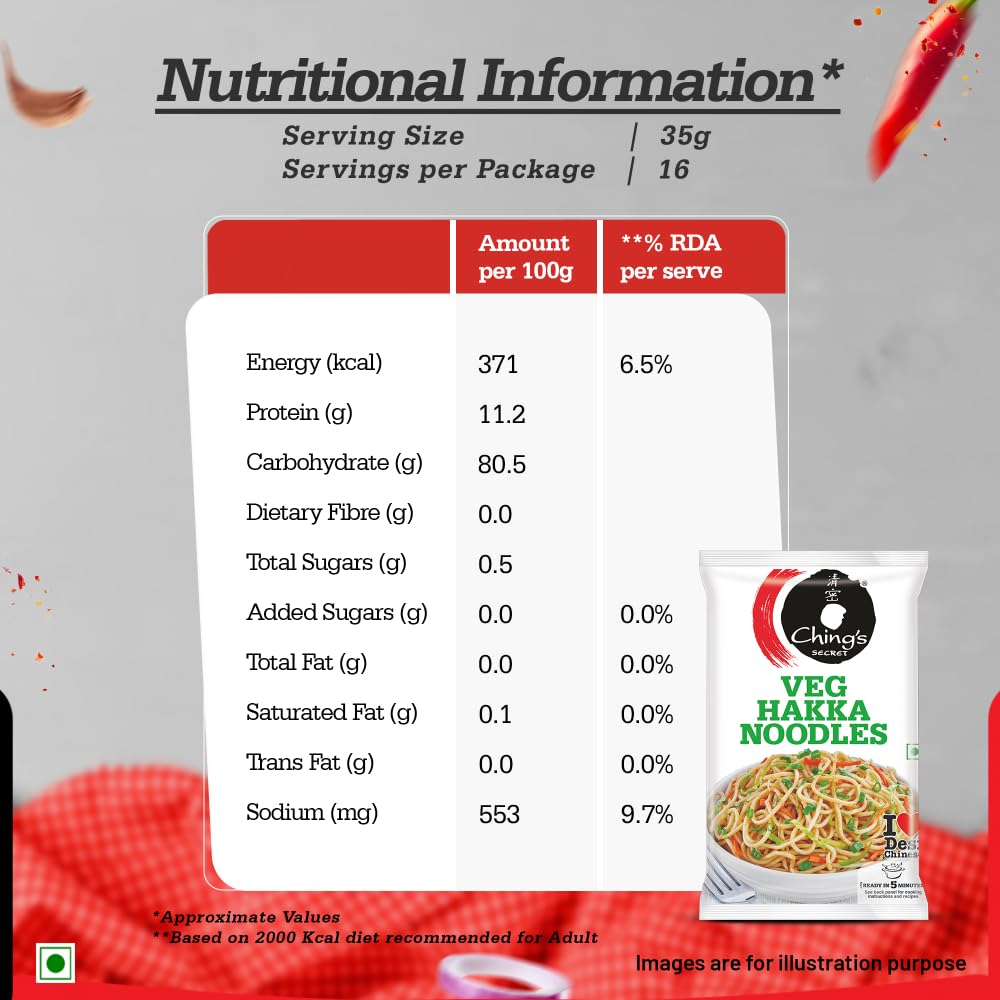 Ching's Veg Hakka Noodles are the right texture cooks easily and prepared hygienically using advanced technology that retains more flavour on the surface to send your taste buds into overdrive. The easy-to-cook noodles are vegetarian. Make mouth-watering Hakka noodles at home with Ching's Secret Veg Hakka Noodles stir-fried with your favourite veggies and sprinkled with Ching's Hakka Noodle Masala for an extra punch. How To Make: Boil 5-6 cups of water in a pan. Soak the Noodles in the water cover and let it stand for 5 to 7 minutes ( No need to cook). Drain the water and wash Noodles under running water. Noodles are ready for further use as required.