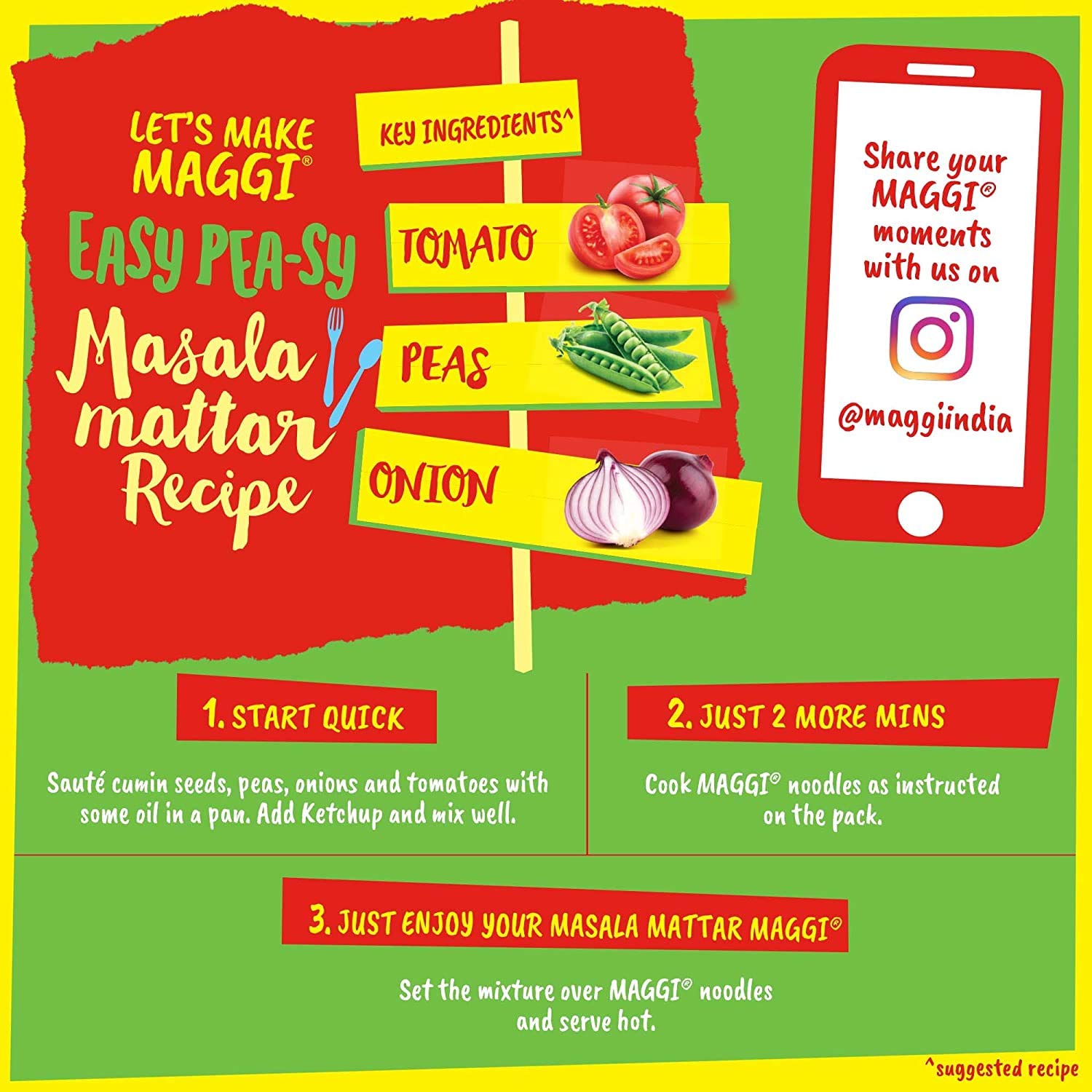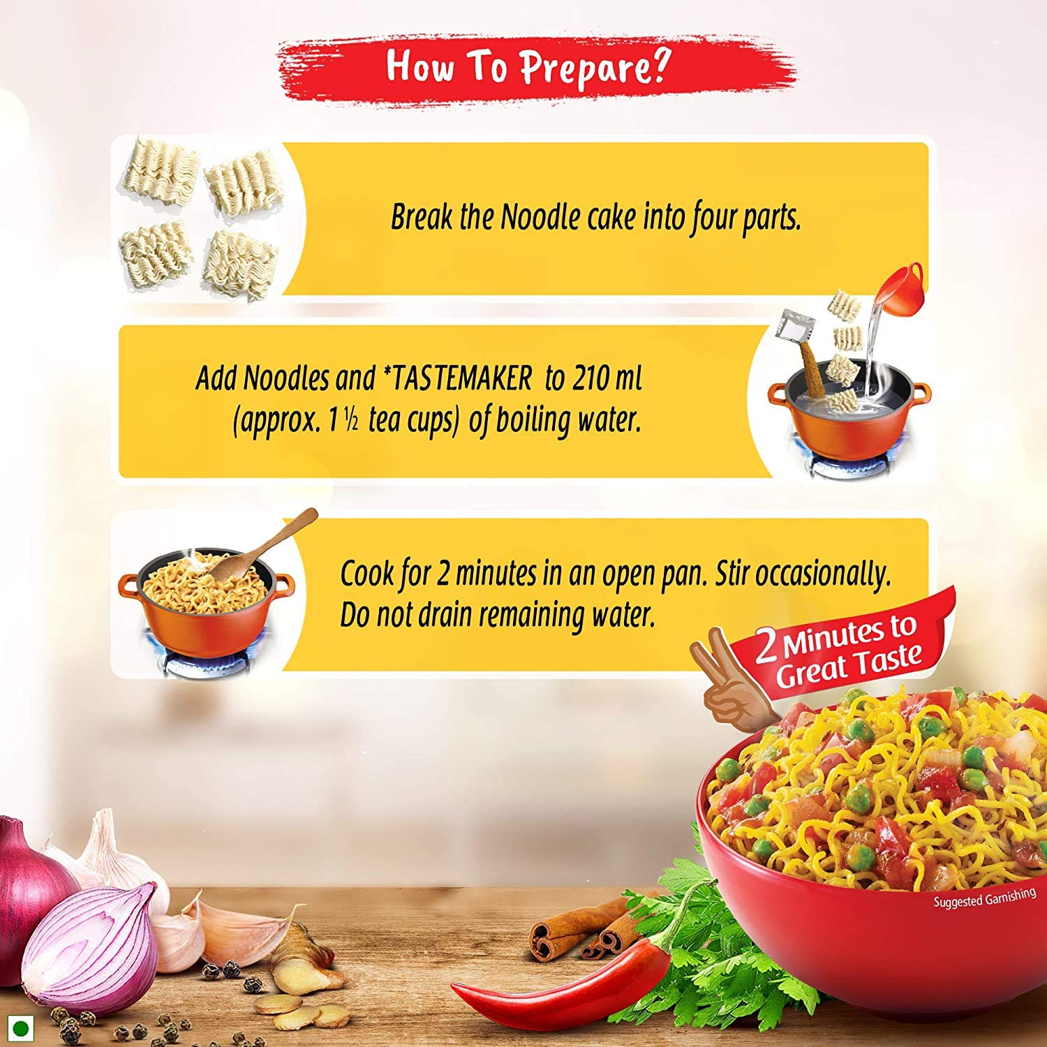 India's favourite Masala Noodles MAGGI 2-minute Noodles now comes with the goodness of Iron. Each portion (70g) of MAGGI Masala Noodles provides you with 15% of your daily Iron requirement (*as per the Daily Dietary Allowances for an Adult Sedentary Male (ICMR 2010). Containing your favourite masala taste MAGGI noodles are made with the finest quality spices and ingredients. Make your bowl of MAGGI even better by chopping up some vegetables dropping in an egg or throwing in your favorite ingredients. Usage Instructions: Prepare a delicious meal in just 2 minutes with MAGGI Boil 1½ cup of water and add the TASTEMAKER along with the noodle cake broken into 4. Cook for 2 minutes in open pan while you stir occasionally. Do not drain the remaining water. Store any remaining MAGGI noodles in an airtight container to retain freshness. Serving Instructions: Garnish with your favourite veggies and serve hot. Storage Conditions: Store in a cool dry and hygienic place to protect from insects pests and strong odours. Customer might either receive me-time treat recipe or easy-peasy recipe .