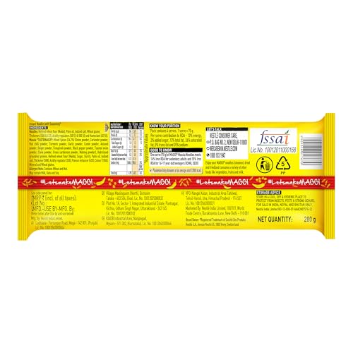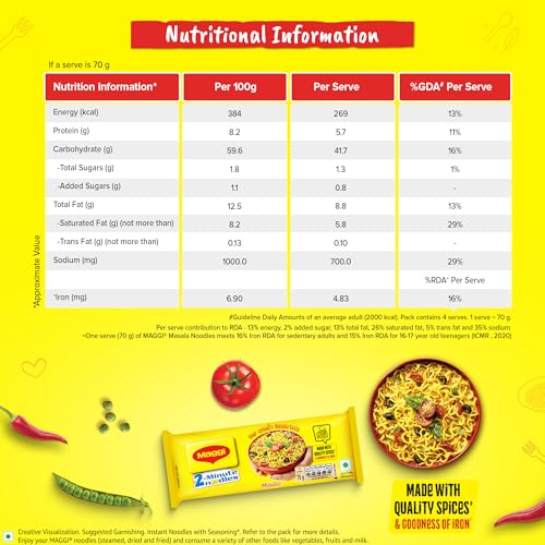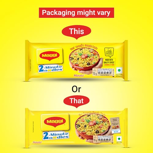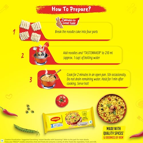 MAGGI 2-Minute Instant Masala Noodles is a favorite among people of all ages. MAGGI Masala instant noodles now come with the goodness of iron. Each portion (70g) of MAGGI masala noodles provides you with 15% of your daily iron requirement. It is just the perfect choice for those who need a quick and satisfying meal. MAGGI instant noodles are made with the choicest quality spices and ingredients to provide a great taste and experience. Usage instructions: Prepare a delicious meal in just 2 minutes with MAGGI â boil 1 cup of water and add the tastemaker along with the noodle cake broken into 4 pieces. Cook for 2 minutes in an open pan while you stir occasionally. Do not drain the remaining water. Garnish with your favorite veggies and serve hot. Storage instructions: Store in a cool dry and hygienic place to protect from insects pests and strong odors.