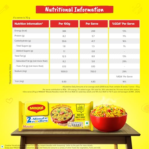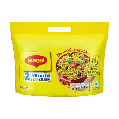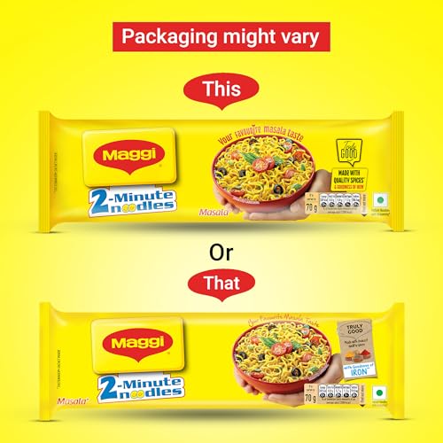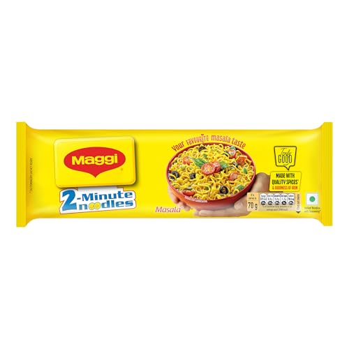 MAGGI 2-Minute Instant Masala Noodles is a favorite among people of all ages. MAGGI Masala instant noodles now come with the goodness of iron. Each portion (70g) of MAGGI masala noodles provides you with 15% of your daily iron requirement. It is just the perfect choice for those who need a quick and satisfying meal. MAGGI instant noodles are made with the choicest quality spices and ingredients to provide a great taste and experience. Usage instructions: Prepare a delicious meal in just 2 minutes with MAGGI â boil 1 cup of water and add the tastemaker along with the noodle cake broken into 4 pieces. Cook for 2 minutes in an open pan while you stir occasionally. Do not drain the remaining water. Garnish with your favorite veggies and serve hot. Storage instructions: Store in a cool dry and hygienic place to protect from insects pests and strong odors.