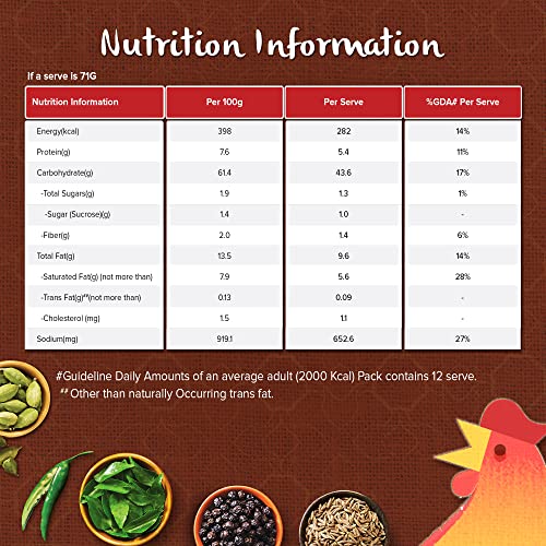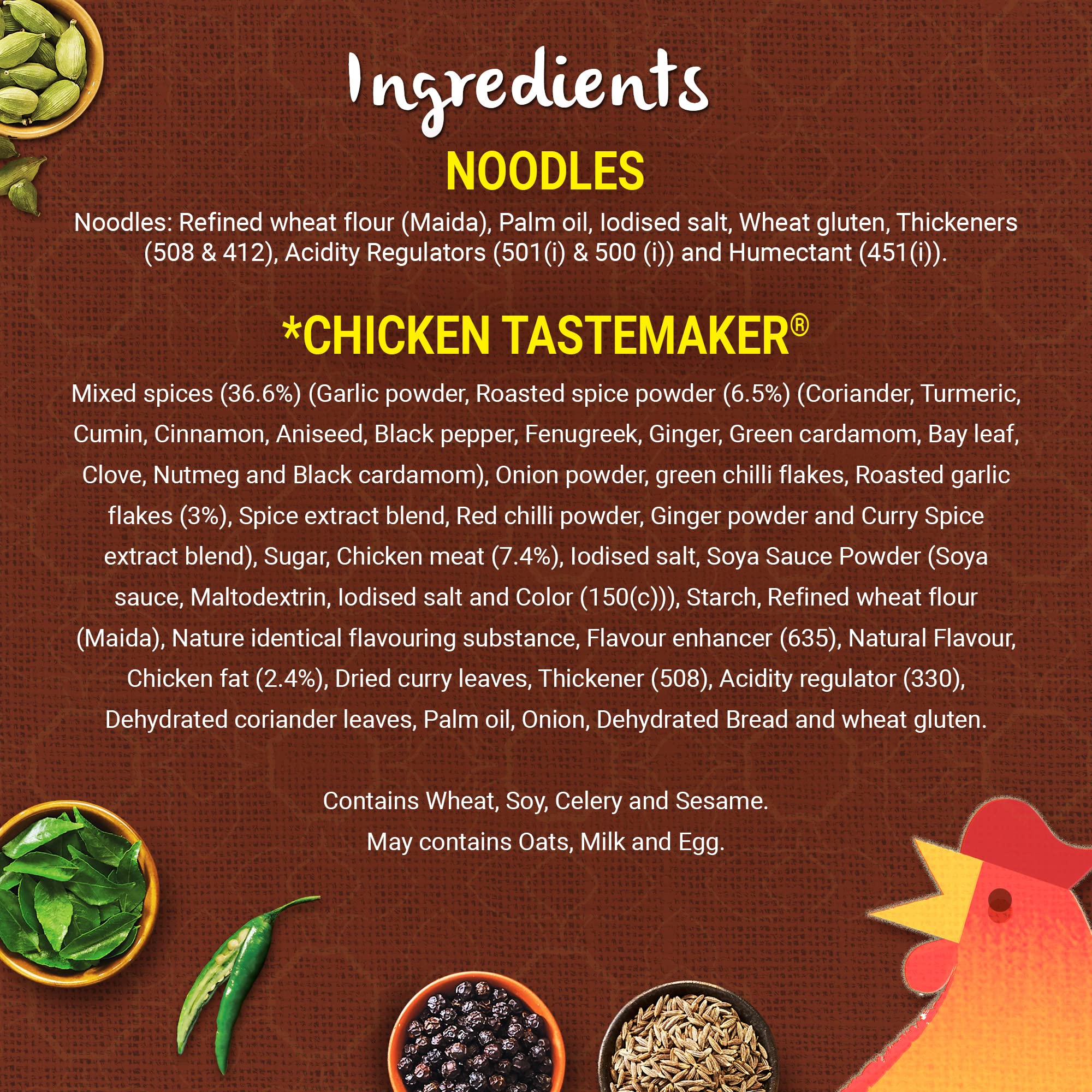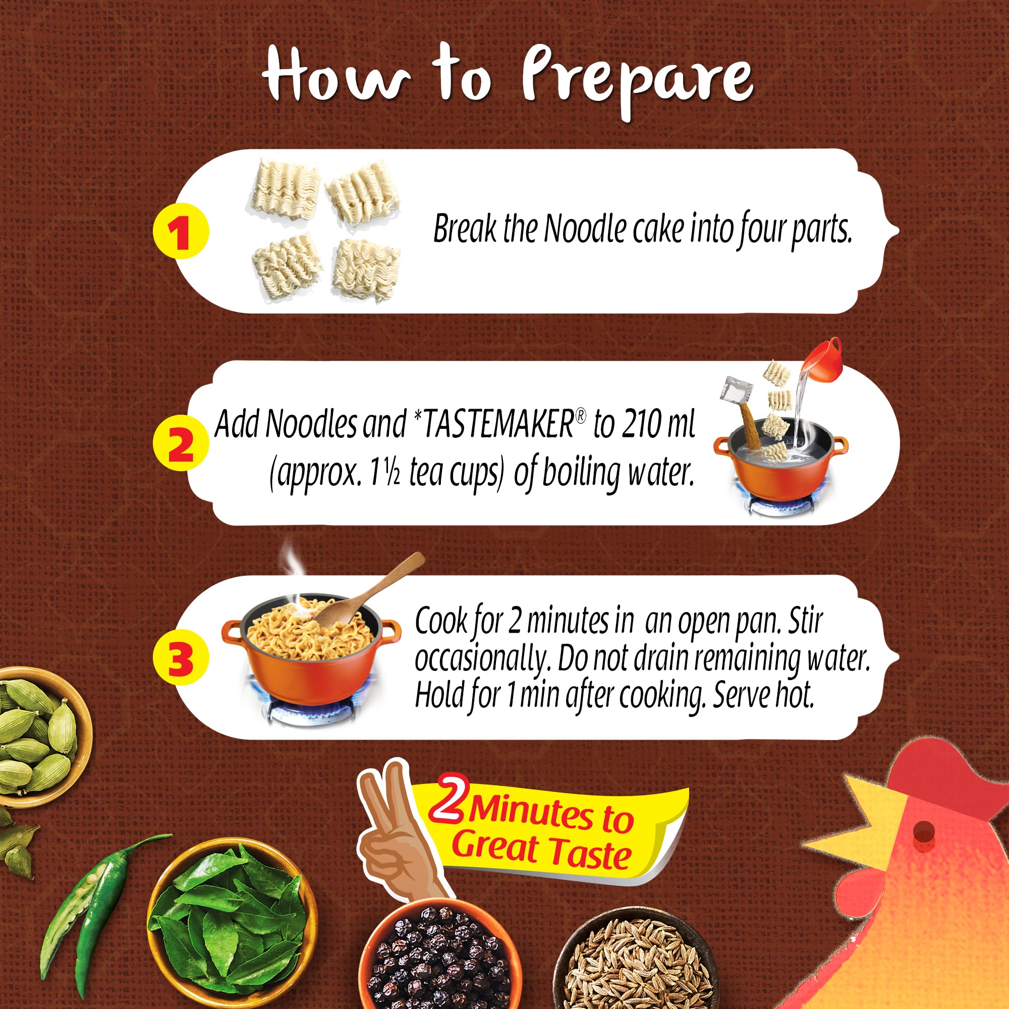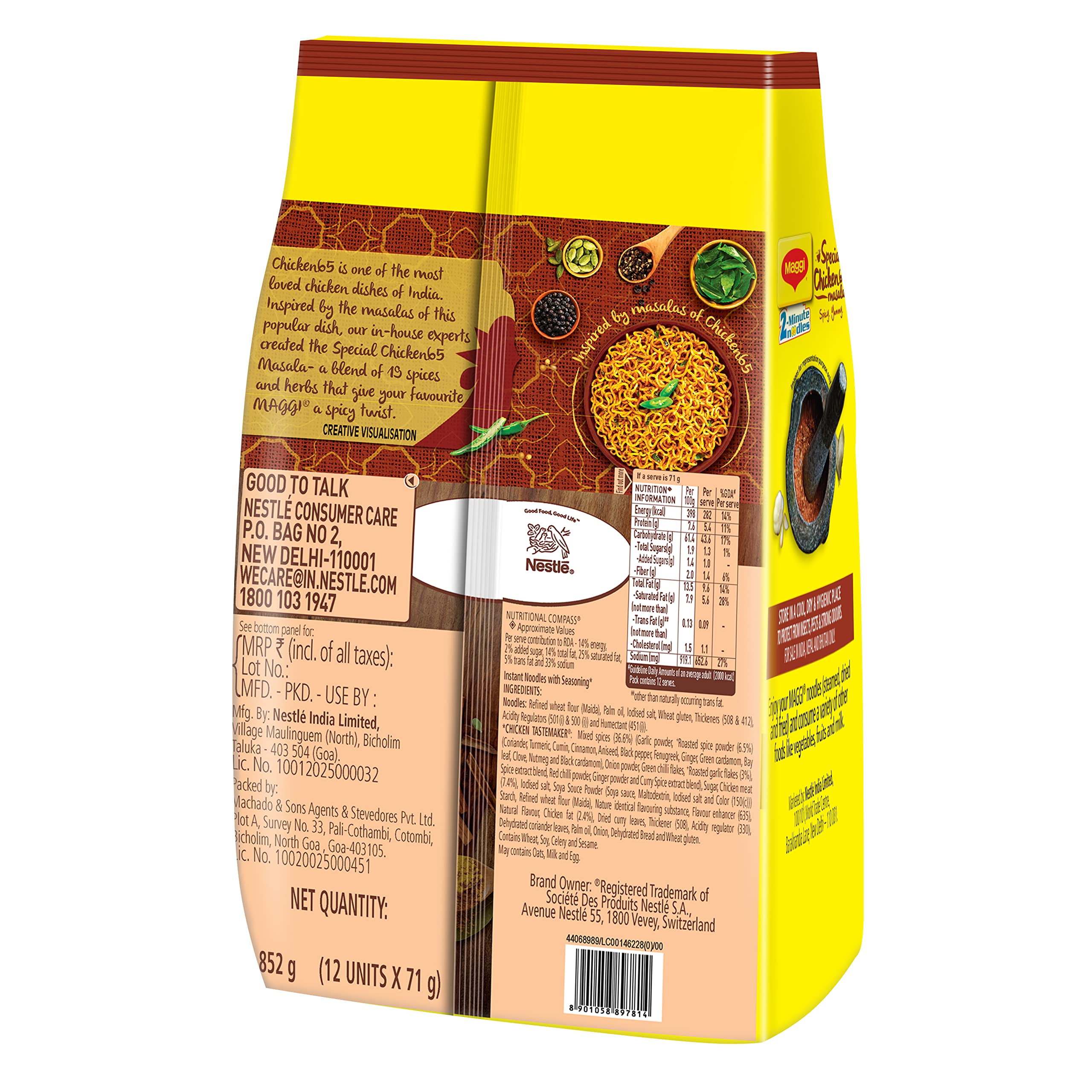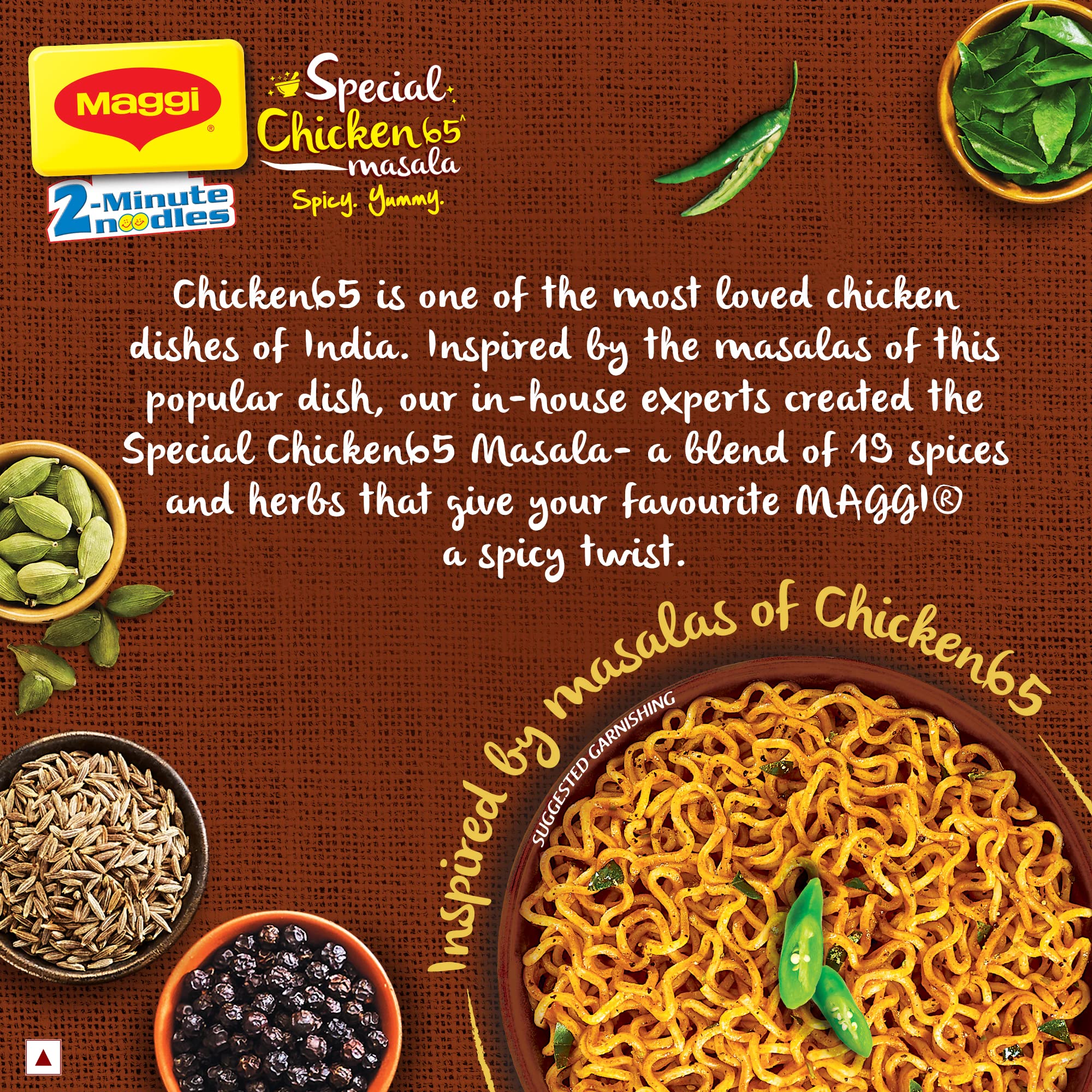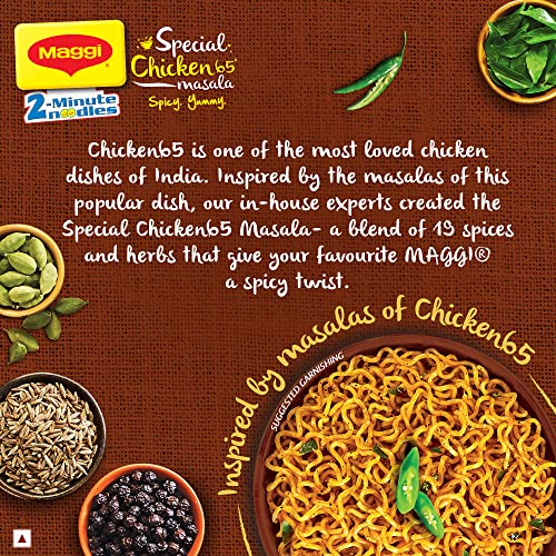 Why MAGGI Special Chicken65 Noodles? Chicken 65 is one of the most loved chicken dishes of India. Inspired by the masalas of this popular dish our in-house experts created Special Chicken65 Masala- a blend of 19 spices and herbs that give your favourite MAGGI a spicy twist. How to enjoy a delicious recipe with a great taste? Break the noodle cake into 4 parts. Add noodles and the tastemaker to 210 ml. (approx. 1.5 teacups)of boiling water. Cook for 2 minutes in an open pan. Stir occasionally. Do not drain the remaining water. Hold for 1 min after cooking. Serve hot. Enjoy your MAGGI noodles (steamed dried and fried) and consume a variety of other foods like vegetables fruits and milk. Had an amazing and magical Maggi experience? Drop a review in the feedback section! Storage: Store in a cool dry and hygienic place. Allergens: May contain eggs and milk solids.