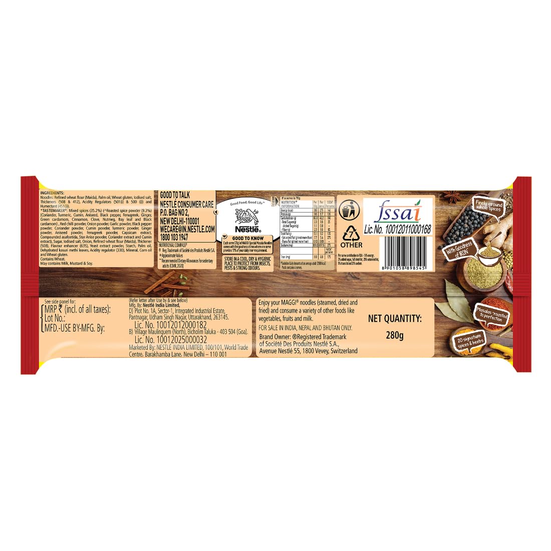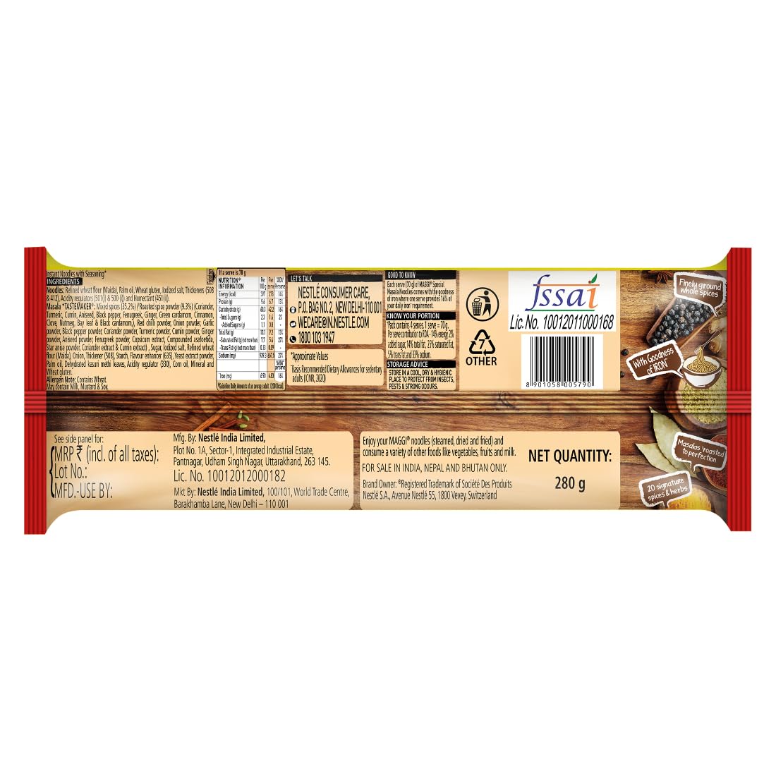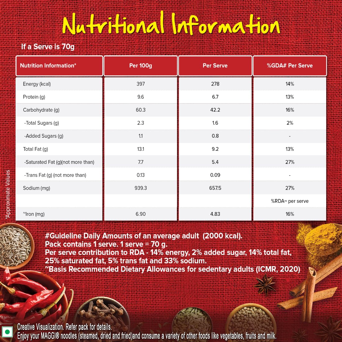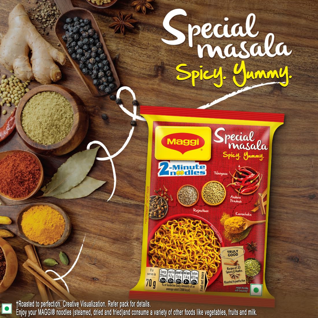 Nestle MAGGI 2-minutes masala noodles have been a classic indian snack since more than a decade. To take your favourite masala taste experience to the next level MAGGI introduces the new MAGGI special masala noodles a recipe of 20 spices and herbs that provides a more redefined MAGGI masala experience. Made with a blend of finely ground and whole spices and herbs the all new MAGGI instant noodles have an extra special and flavourful tastemaker sachet inside. These spices have been roasted to perfection providing a distinct aroma and colour to your MAGGI noodles. Usage : 1. Break the Noodle cake into four parts. 2. Add Noodles and TASTEMAKER to 210 ml (approx. 1 cup) of boiling water. 3. Cook for 2 minutes in an open pan. Stir occasionally. Do not drain remaining water. Hold for 1 min after cooking. Serve Hot. Storage instructions : Store in cool dry & hygienic place.