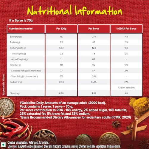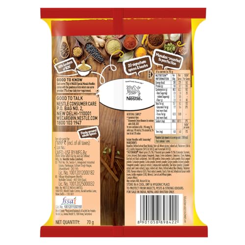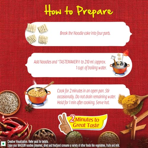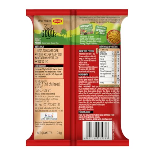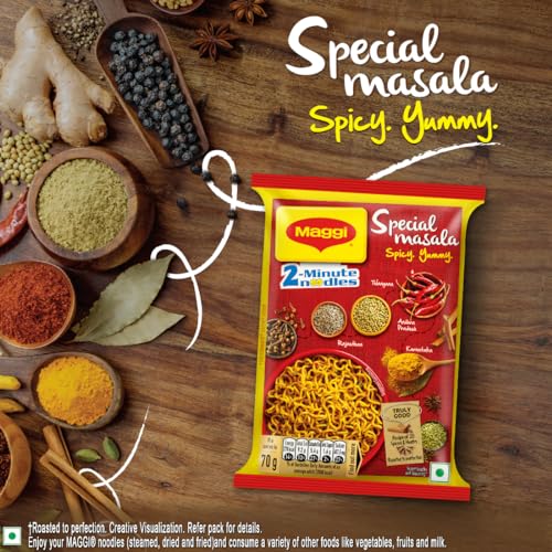 Nestle MAGGI 2-minutes masala noodles have been a classic indian snack since more than a decade. To take your favourite masala taste experience to the next level MAGGI introduces the new MAGGI special masala noodles a recipe of 20 spices and herbs that provides a more redefined MAGGI masala experience. Made with a blend of finely ground and whole spices and herbs the all new MAGGI instant noodles have an extra special and flavourful tastemaker sachet inside. These spices have been roasted to perfection providing a distinct aroma and colour to your MAGGI noodles. Usage : 1. Break the Noodle cake into four parts. 2. Add Noodles and TASTEMAKER to 210 ml (approx. 1 cup) of boiling water. 3. Cook for 2 minutes in an open pan. Stir occasionally. Do not drain remaining water. Hold for 1 min after cooking. Serve Hot. Storage instructions : Store in cool dry & hygienic place.